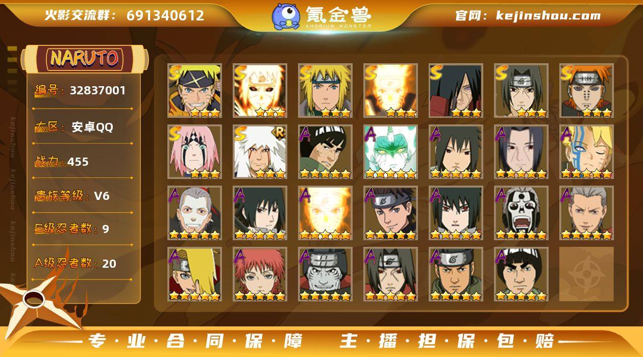 MHY4134【可二次】【S忍者9 A忍者20 通灵13】【安卓Q-3843区-134级-V6-455万战力】【S级】宇智波斑「秽土转生·解」 漩涡鸣人·宇智波佐助 自来也「舞之豪杰」 波风水门 宇智波鼬「须佐能乎」 漩涡鸣人「九喇嘛连结」 波风水门「九喇嘛连结」 春野樱「忍界大战」 佩恩「天道」【A级】飞段 宇智波泉奈 飞段「死司凭血」 漩涡鸣人「九尾查克拉」 波风水门「青年」 宇智波佐助「须佐能乎」 迈特凯 宇智波佐助「万花筒写轮眼」 迈特凯「青春爆炸」 迪达拉 猿飞日斩「火影继承人」 猿飞阿斯玛 大野木「侠隐江湖」 宇智波鼬 飞段「恶灵之影」 蝎 干柿鬼鲛 小南「神驹佑将」 巳月「仙人模式」 漩涡博人「桃式显现」【B级】佐井 漩涡鸣人「第一尾」 奈良鹿丸「最终章」 羽高「六尾人柱力」 野原琳「漂泊浪客」 天天「疾风传」 惠比寿 春野樱「忍者少女」 李洛克「疾风传」 矢仓「三尾人柱力」 宇智波佐助「疾风传」 佩恩「地狱道」 重吾「忍界大战」 夕日红 大和「暗部」 佩恩「人间道」 御手洗红豆「新春限定」 宇智波鼬「暗部」 天天「峨眉宗师」 日向花火「武当宗师」 漩涡玖辛奈 马基 大和 白 秋道丁次「疾风传」 佩恩「饿鬼道」 旗木卡卡西「暗部」 山中井野「疾风传」 佐井「最终...