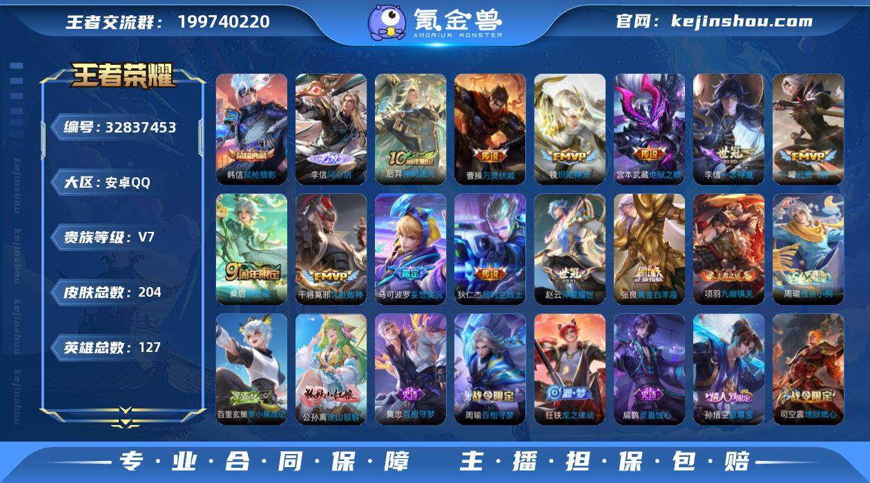 安卓Q-V7-最强王者段位-127英雄-204皮肤-1典藏皮肤-1无双-12传说-51史诗 【英雄全皮】:孙权全皮 【荣耀典藏】:韩信弑枪猎影 【无双皮肤】:李信问心剑 【传说皮肤】:后羿神树通天,曹操万灵伏威,桑启鸣野蒿,马可波罗妄想实况,赵云淬星耀世,镜炽阳神光,曜云鹰飞将,李信一念神魔,张良黄金白羊座,干将莫邪久胜战神,宫本武藏地狱之眼,狄仁杰超时空战士 【限定皮肤】:姜子牙天穹之誓,狄仁杰阴阳师,赵云皇家上将,钟无艳超时空战士,吕布猎兽之王,元歌云间偶戏,元歌无心,甄姬落雪兰心,马可波罗妄想实况,狄仁杰魔术师,狄仁杰万华元夜,达摩沙漠行僧,项羽海滩派对,老夫子醍醐杖,程咬金演武夺筹,兰陵王金庭之子,亚瑟潮玩骑士王,孙悟空至尊宝,李元芳云中旅人,钟馗驱傩正仪,干将莫邪胡桃夹子,雅典娜黎明之约,鬼谷子原初探秘者,鬼谷子五谷丰年,苏烈千军破阵,沈梦溪大漠名商,裴擒虎李小龙,上官婉儿梁祝,鲁班大师探海日志,桑启海盐诗旅,艾琳流音漫舞,司空震地狱燃心,张良古海寻踪,高渐离燃音魔法,妲己灵卜魔法,鬼谷子天穹祈灯,伽罗琥珀纪元,姬小满妄想食味,沈梦溪龙舞盛年,刘邦剑破天穹 【赛季限定】:老夫子醍醐杖,鬼谷子原初探秘者,...