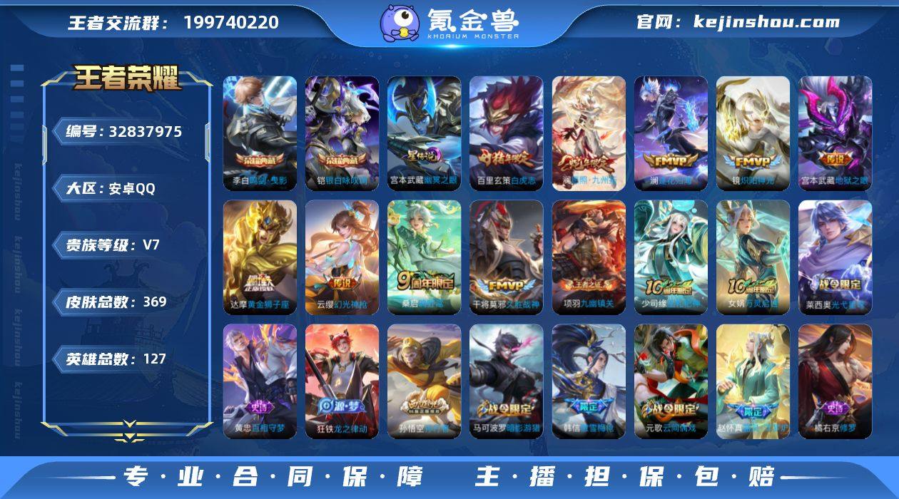 V7 2典藏 10传说 1星元 369皮肤 127英雄 【2水晶】李白-鸣剑·曳影,铠-银白咏叹调【10传说】百里玄策-白虎志,达摩-黄金狮子座,干将莫邪-久胜战神,宫本武藏-地狱之眼,镜-炽阳神光,澜-逐花归海,桑启-鸣野蒿,云缨-幻光神枪,澜-愿照·九州拓【1星元】宫本武藏-幽冥之眼【87史诗】元歌-无心,鬼谷子-五谷丰年,赵云-未来纪元,钟无艳-超时空战士,狂铁-电玩高手,澜-赏金猎手,明世隐-吟游魔法,阿轲-节奏热浪,安琪拉-心灵骇客,白起-星夜王子,百里守约-特工魅影,百里玄策-原初追逐者,蔡文姬-舞动绿茵,曹操-幽灵船长,嫦娥-拒霜思,程咬金-功夫厨神,妲己-女仆咖啡,妲己-魅力维加斯,大乔-猫狗日记,大乔-白蛇,狄仁杰-魔术师,狄仁杰-鹰眼统帅,貂蝉-圣诞恋歌,伽罗-箭羽风息,干将莫邪-真爱魔法,宫本武藏-鬼剑武藏,韩信-傲雪梅枪,花木兰-水晶猎龙者,橘右京-修罗,黄忠-火炮绅士,铠-曙光守护者,兰陵王-暗隐猎兽者,李白-千年之狐,李元芳-逐浪之夏,廉颇-地狱岩魂,刘邦-德古拉伯爵,刘禅-绅士熊喵,刘禅-天才门将,露娜-紫霞仙子,吕布-圣诞狂欢,吕布-末日机甲,马可波罗-暗影游猎,米莱狄-胡桃异想国,墨子-金属风暴,墨子-龙骑士,上官婉儿-梁祝,裴擒虎-李小龙,沈梦溪-月团寄思,司马懿-暗渊魔法,孙策-猫狗日记,孙...