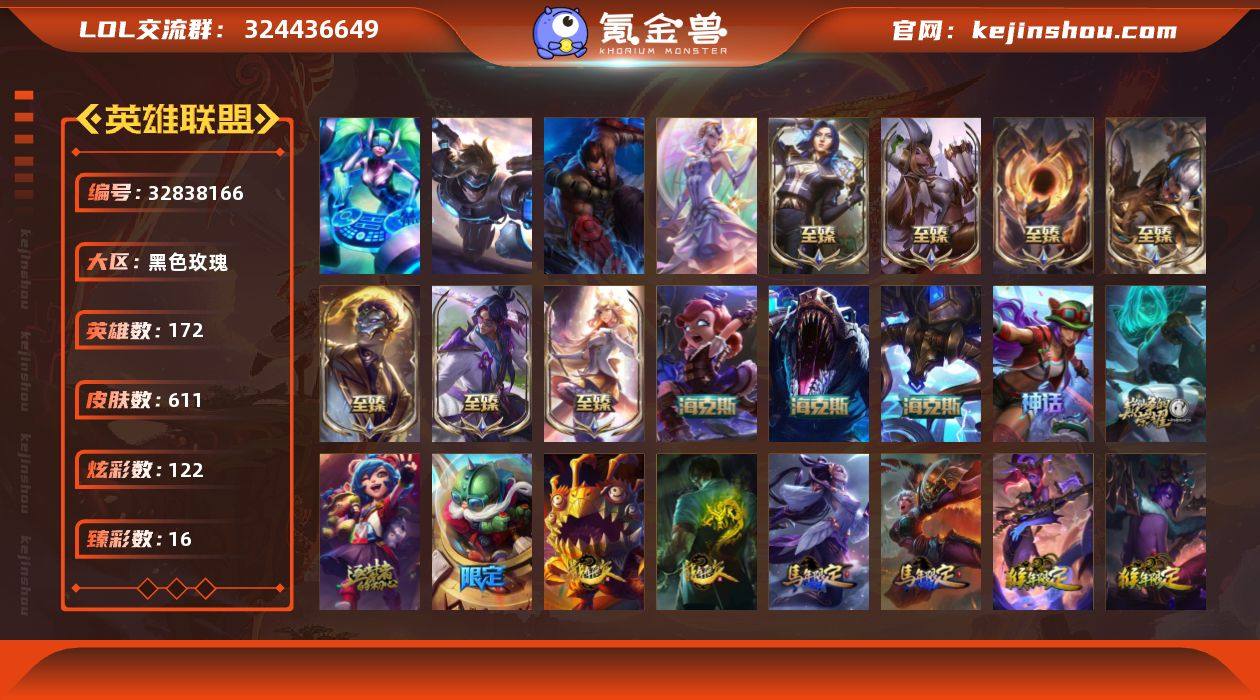 【龙瞎 皇冠号】未定级段位-172英雄-611皮肤-122炫彩-4终极-14神话-102限定-48传说-148史诗 【热门头像】:春晖神女头像,星守索拉卡头像 【神话皮肤】:十周年纪念安妮,源代码乐芙兰,十五周年纪念希维尔,神凰行者瑞羽圣凰艾尼维亚 【至臻皮肤】:至臻灵魂莲华易,至臻星之守护者索拉卡,至臻魅惑女巫厄运小姐,至臻双城之战2指挥官凯特琳,至臻暗星墨菲特,至臻焰执事布兰德,至臻神龙尊者炎龙瑟提 【海克斯皮肤】:海克斯科技安妮,海克斯科技阿利斯塔,海克斯科技雷克顿 【臻彩皮肤】:天龙之子卡莎飞龙乘云,无畏骑士瑟庄妮赤子初心,玉净夜叉凯特琳炫金神机,墨之影武者亚索金墨耀影,征服者韦鲁斯炫金,征服者阿利斯塔炫金,冠军典狱长锤石凯旋圣装,霸天战士雷恩加尔星啸天火,黎明使者锐雯黑夜使者,玉剑传说寒潭夭夭胭脂,灵魂莲华亚索霜见之时,可爱可爱粉红红布里茨,魔女阿卡丽虚荣,净雪之月莫甘娜冬虹,红莲之刃锐雯,心之钢伊泽瑞尔天纵才华 【年限皮肤】:龙的传人李青,定海神珍孙悟空,醒狮克格莫,碧玉之牙卡西奥佩娅,替父从军花木兰,广寒仙子嫦娥,紫金罗刹莫甘娜,玉净夜叉凯特琳,张辽文远,司马懿仲达,南天之怒沃里克,北辰之威内瑟斯,春晖...