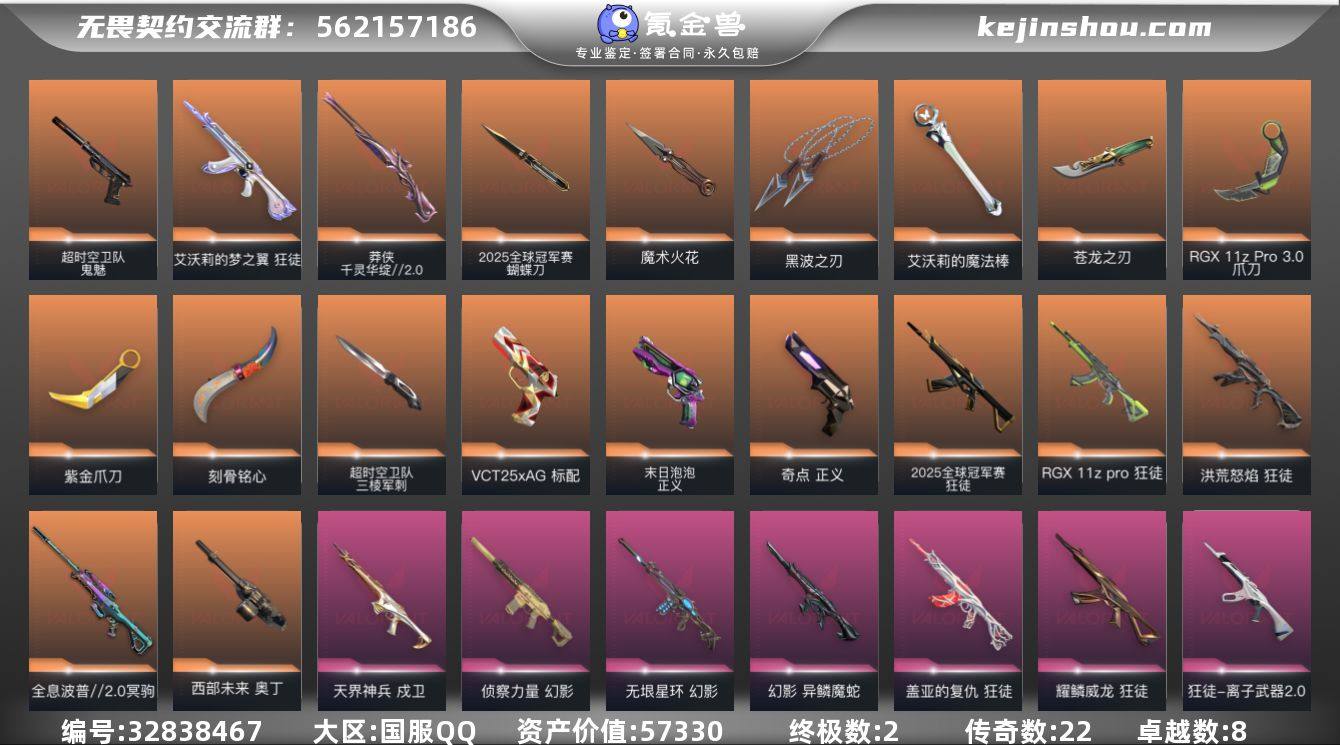 【自带包赔 可赔三倍】:库存价值 57330 【限定】: 2025全球冠军赛 狂徒, 2025全球冠军赛 蝴蝶刀, 5周年//公测重制版 苍龙之刃 【近战】: 超时空卫队 三棱军刺, 紫金爪刀, 2025全球冠军赛 蝴蝶刀, 魔术火花, 艾沃莉的魔法棒, 黑波之刃, 5周年//公测重制版 苍龙之刃, RGX 11z Pro//3.0 爪刀, 刻骨铭心 【狂徒】: 耀鳞威龙 狂徒, 2025全球冠军赛 狂徒, 盖亚的复仇 狂徒, 艾沃莉的梦之翼 狂徒, 离子武器//2.0 狂徒, RGX 11z Pro 狂徒, 洪荒怒焰 狂徒 【幻影】: 异鳞魔蛇 幻影, 侦察力量 幻影, 无垠星环 幻影 【冥驹】: 堕天遗武 冥驹, 全息波普//2.0 冥驹 【正义】: 奇点 正义, 末日泡泡 正义 【戍卫】: 天界神兵 戍卫 【鬼魅】: 超时空卫队 鬼魅 【标配】: VCT25 x AG 标配 【奥丁】: 西部未来 奥丁 【莽侠】: 千灵华绽//2.0 莽侠 【概要】: 总皮肤 82终极2 传奇22 卓越8 刀皮 英雄28 LV192 历史最高: 铂金当前段位:黄金 已使用 1020R点 剩余45 R点 可二次 信誉分100分 卡面、挂饰、其他皮肤请看截图 道具、段位等以实际验号为准。如账号因没有维护,赛季更新等不可抗因素发生变化,不属于账号质量问题"
