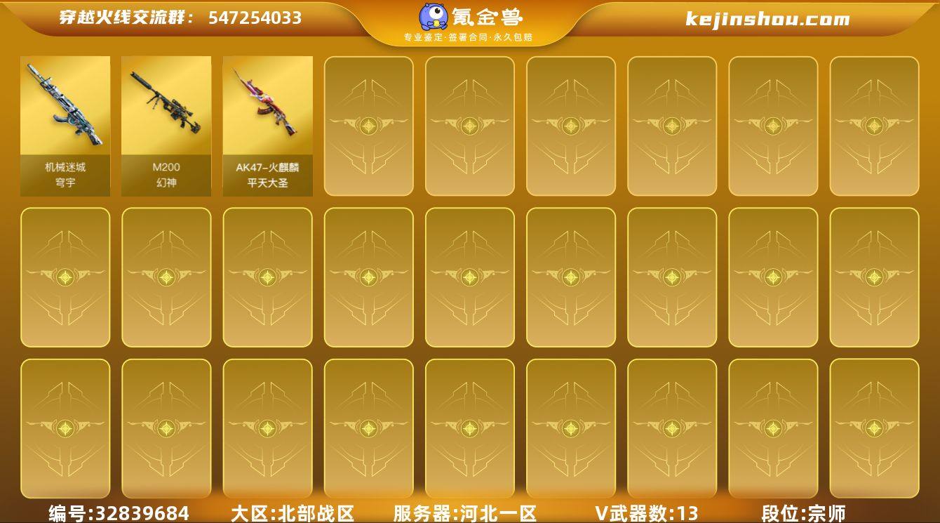 河北一区-14V-0王者武器数-0炫金武器数 【热门武器】:M200-幻神,QBZ03-街机 【皮肤】:幻神-周瑜皮肤,幻神-权 皮肤,火麒麟-平天大圣 【角色】:风暴女,娟娟,0号玩家,零-水下丽影,灵狐者-X,潘多拉-X,蛇姬,维纳斯,雪莉杨-摸金校尉,夜玫瑰-宠粉,樱-战斗天使 【人偶武器】:灵狐娃娃手雷 【英雄级武器】:机械迷城-穹宇,M200-幻神,屠龙-斗烈龙驹 【其他武器】:源·火麒麟,源·雷神,魂·M4A1-雷神-化蛇*2,魂·雷神-萌柴,源·黑骑士,魂·黑骑士-幻能朋克,魂·黑骑士-破浪10年,御·黑骑士·哪吒闹海,魂-死神-机甲核心,源·AK47-黑武士,魂·黑武士-锋芒破茧,源·武圣,M4A1-青龙-掌上穿越火线,魂·HK417-朱雀-凤灵,灵·HK417-朱雀-甜蜜火力*2,源-金色蔷薇,魂·QBZ03-金色蔷薇-蛇姬,QBZ03-文殊坊,魂·玫瑰精灵-傲梅,源-极光,源·天龙,魂·天龙-彼岸花,魂·裁决-神秘按键,魂·毁灭-秦师*2,御·毁灭-黑大圣,魂·Barrett-金色蔷薇-蛇姬,魂·Barrett-朱雀- 新春神龙,源·Barrett-朱雀,灵·Barrett-朱雀-炫光,魂·炼狱-电子连击*2,魂·炼狱-玩具枪,魂·炼狱-蒸汽钟表,加特林-炼狱-掌火,御·炼狱-女娲,魂·天神-宇航兔兔*2,源·武圣glock,魂·擎天-破浪10年,魂·擎天-蒸...