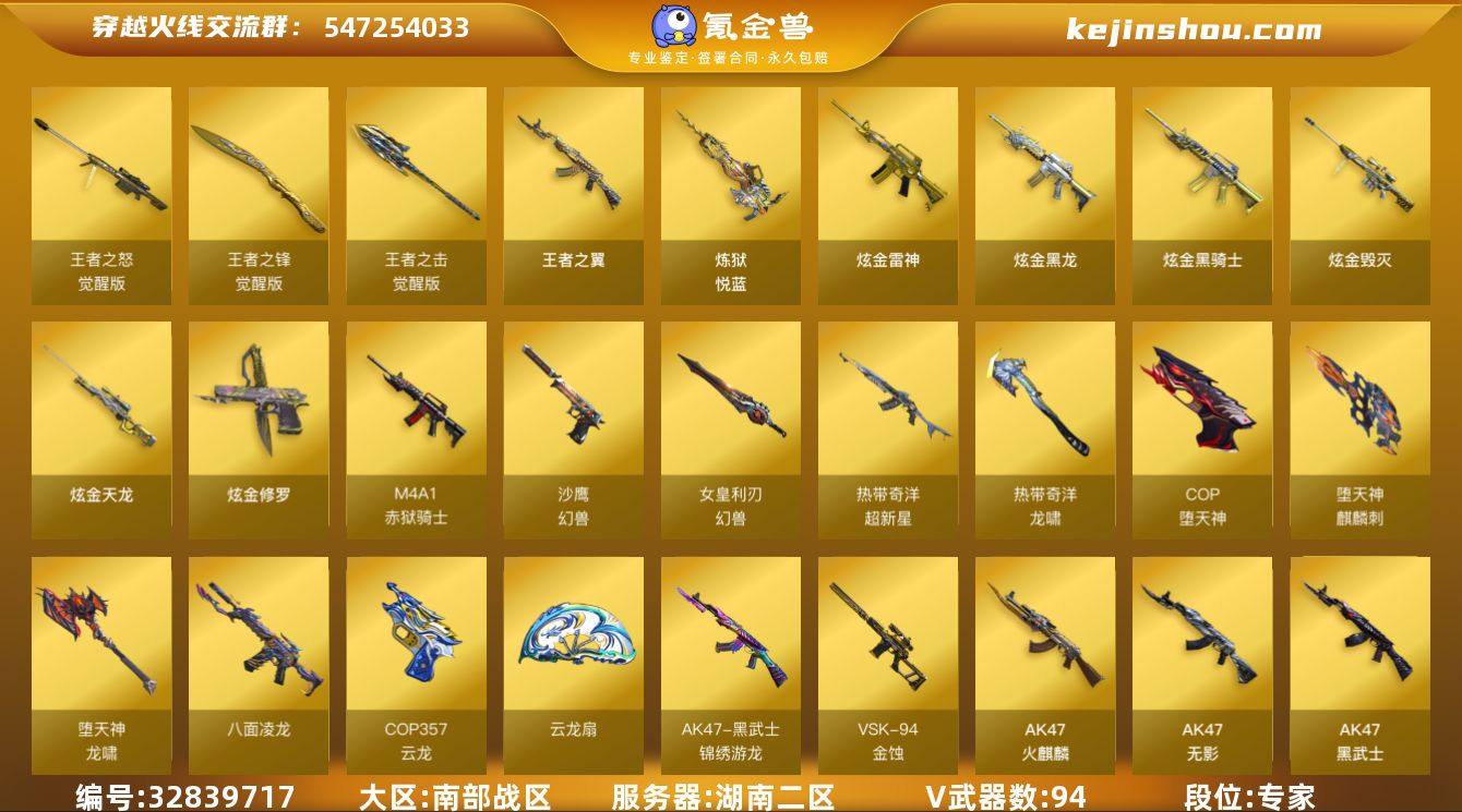 【ky6549】湖南二区-104V-6王者武器数-6炫金武器数 【热门武器】:QBZ03-金色蔷薇,八面凌龙,死亡之眼,M4A1-黑骑士,汤姆逊-烈龙*3,RPK-盘龙,COP-堕天神,沙鹰-修罗*5,高爆手雷-幻兽 【王者炫金武器】:王者之翼*2,炼狱-悦蓝,炫金骑士,炫金黑龙,炫金雷神,炫金毁灭,炫金天龙,炫金修罗 【音效卡】:屠龙-动感闪耀 音效卡,M4A1-黑骑士音效卡,Barrett-毁灭音效卡 【皮肤】:雷神-能量核心,毁灭-星空,毁灭-虹光风暴 皮肤,毁灭-英雄计划 皮肤,黑龙-能量核心,黑龙-暗月,黑骑士耀金皮肤,无影-暗月,天启-暗月,战神-粉色甜心皮肤*2,战神-紫绶金章皮肤*8,战神-流金岁月皮肤*4,天龙-秘银,极光-能量核心,修罗-能量核心,屠龙-荣耀之锋,屠龙-破浪逐光 皮肤,龙啸-蛇姬 皮肤 【角色】:零,葵,樱,魅影,迷迭香,雨墨,华,审判者,战地猎狐,王者之瞳,王者王力宏,蛇隐宗,奇洋探员,乔伊教练,飞虎队-X,风暴女,娟娟,灵狐者-黄金海岸,麻雀,曼陀罗-X,潘多拉-X,潜龙队-X,青霞仙子,蛇姬,铁骑荣耀,铁扇公主-暗灵,雪莉杨,夜玫瑰-宠粉,影武者-X,游珑儿 【人偶武器】:巴雷特-零-水下丽影,COP-旗袍,M4A1-刀锋,迷你深渊冰龙,迷你牛牛*2,生化手雷...