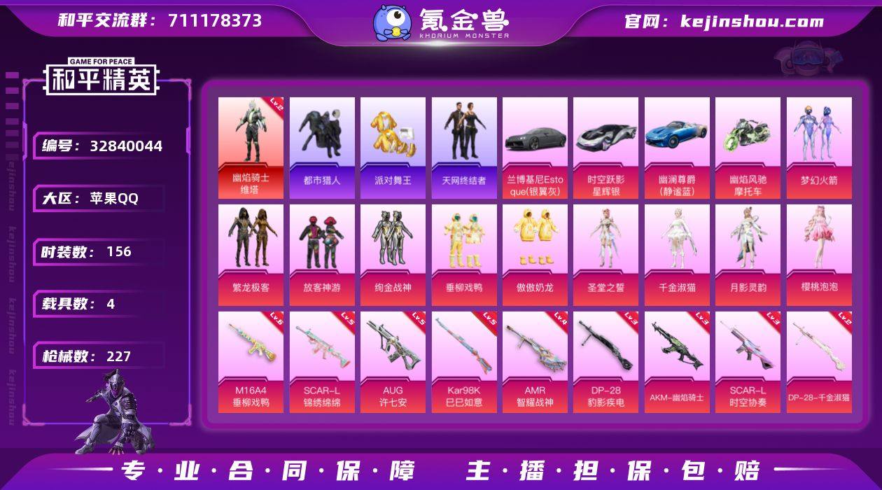 苹果【红装号 幽焰骑士-维塔(二级)/AKM-魔法神域(一级)/AKM-幽焰骑士(三级)/M16A4-垂柳戏鸭(六级)/SCAR-L-锦绣绵绵(五级)/粉装-梦幻火箭/套装-都市猎人/套装-派对舞王/套装-天网终结者/粉装-放客神游/角色-千金淑猫/兰博基尼Estoque(银翼灰)】 手Q-1神装-10粉装-15特效枪-4载具-3粉色飞行器-74264热力值-13王牌印记-156套装-227枪皮 【红色神装等级】:幽焰骑士-维塔(二级) 【红色角色神装】:幽焰骑士-维塔 【热门品类】:粉装-梦幻火箭,粉装-繁龙极客,套装-浪漫天命,套装-都市猎人,套装-派对舞王,套装-天网终结者,套装-龟仙人,套装-暗影哥特,套装-粉红小猪 【粉色套装】:粉装-梦幻火箭,粉装-放客神游,粉装-绚金战神,粉装-垂柳戏鸭,粉装-傲傲奶龙,角色-圣堂之誓,粉装-繁龙极客,角色-千金淑猫,角色-月影灵韵,角色-樱桃泡泡 【粉色枪皮等级】:AKM-魔法神域(一级),AKM-幽焰骑士(三级),M16A4-垂柳戏鸭(六级),SCAR-L-锦绣绵绵(五级),SCAR-L-时空协奏(三级),AUG-许七安(五级),ACE32-萌骑漫游(二级),UMP45-萌骑冒险(二级),AKS-74U-森灵之息(一级),Kar98K-巳巳如意(五级),Mk14-福马献瑞(四级),AMR-智耀战神(四级),AA12-G-萌骑幻想(四级),DP-28-千...