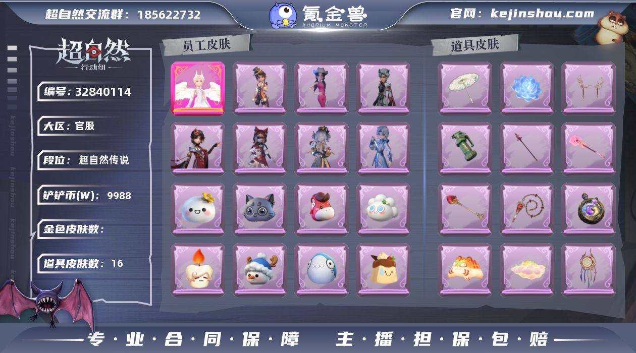 粉皮1;紫皮7;道具皮16;皮肤:小黄-炽天使,零-青云逸歌,爱丽丝-耀眼的你,薇薇安-仙锋小姐,莉莉-莓果陷阱,艾伦-黎明猎手,莉莉-除妖小师妹,阿念-庆宴绮愿;道具:桃木剑-寂潮之刃,传送按钮-逆时审判,伞-郁金春信,喷气背包-乘风溯雪,闪光弹-金戈玄铜,长鞭-缚誓之锁,音响-happy猫,腰包-红运福虎,除颤仪-冰晶般的代价,急救包-蔷薇物语,腰包-私藏的银河,音响-鸣沙鼓,铲子-圣心之泪,夜视仪-敛花容,长枪-罪棘,铲子-赞萌波板糖;饰品:头饰-马上有钱,头饰-太空鲨头套,头饰-雪墩墩头套,头饰-蒜了八,头饰-萨卡班甲鱼头套,头饰-嘻嘻头套,头饰-鱼头怪头套,头饰-滑稽头套,头饰-烛光纪念,头饰-饺饺者头套,头饰-卑微头套,头饰-惊魂南瓜头套,头饰-芝麻糊汤圆,头饰-小财神豚豚头套,头饰-哈士奇头套,头饰-面具马头套,头饰-煤球喵头套,头饰-樱桃奶油布丁,头饰-烈焰红唇头套,头饰-呆滞头套,头饰-像素朋克墨镜,头饰-后室幸存者头套,挂饰-晚安小熊,挂饰-糖果守卫,挂饰-拂云仙,挂饰-钗头凤,背饰-牛啤背包,背饰-梵音莲华,背饰-子夜证词,背饰-白鼬趴趴,背饰-炽天使的余烬,背饰-班卓琴;动作:动作-新年摇,动作-九万字舞,动作-企鹅舞,动作-舞台中心,动作-要糖,动作-拜年,动作-带你逃跑吧,动作-蝴蝶步,动...