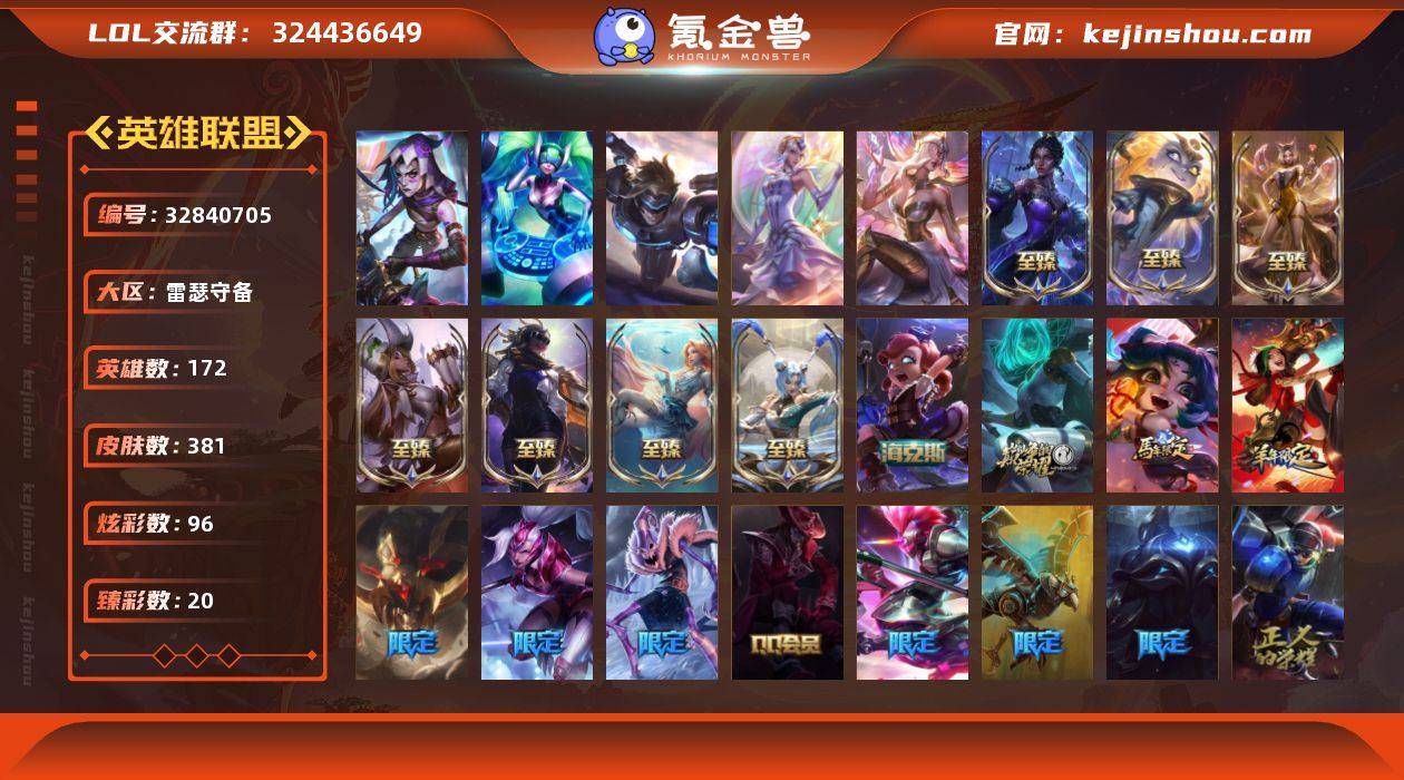 t38812【雷瑟守备】381皮肤 96炫彩 20臻彩 13神话/60限定/28传说/172英雄 账号等级:202段位铂金【重要头像】心型钥匙 万圣节卡特琳娜 青花瓷拉克丝炫彩 灵魂莲华阿狸炫彩 幼犬沃里克 北极星神黛安娜炫彩 神龙烈焰金克丝炫彩 【重要皮肤】双城之战2破碎者金克丝 北极星神梅尔至臻 永恒星灵佐伊至臻 暗裔英雄嘉文四世至臻 玉剑传说琴仙子至臻 海之歌萨勒芬妮至臻 真实伤害赛娜至臻 KDA阿狸至臻 魅惑女巫厄运小姐至臻 海克斯科技安妮 真实伤害突破界限艾克 水晶圣骑塔莉垭 双城之战2范德尔沃里克 双城之战2孤勇者艾克 双城之战2教授黑默丁格 双城之战2救世主维克托 胜利行刑官德莱文 银白审判凯尔 女帝厄运小姐 玉剑传说舞龙卫 黎明使者薇恩 天龙之子斯莫德 神龙烈焰金克丝 龙马烈焰波比 水晶玫瑰阿克尚 甜心之翎洛 甜心宝贝安妮 幽梦玫瑰辛德拉 双城之战2指挥官凯特琳 双城之战2斗士蔚 双城之战2幸存者杰斯 北极星发明家塞拉斯 雪球也能爆炸吉格斯 圣诞捣蛋鬼金克丝 圣诞老人德莱文 冰雪女神辛德拉 魄罗骑士瑟庄妮 平安夜女神娑娜 魅惑女巫莫甘娜 死亡誓约卡特琳娜 海之歌艾希 泳池派对奥莉安娜 泳池派对布隆 电玩战魂赫卡...