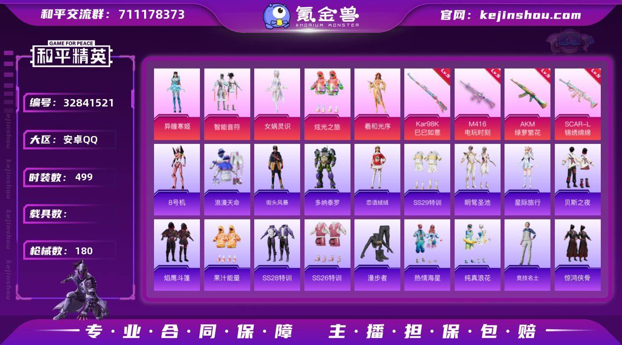【特价出售】安卓Q-2稀有5粉装7特效枪8热门128套装180枪皮 50238热力值 10印记 历史超级王牌8星 【2稀有】 AKM-缤纷海域 浪漫天命 【5粉装】 女娲灵识 异瞳寒姬 炫光之旅 羲和光序 智能音符 【7特效枪】 SCAR-L-锦绣绵绵 (5级) M416-电玩时刻 (5级) M416-灵猫魔法师 (3级) AKM-绿萝繁花 (5级) Kar98K-巳巳如意 (5级) Mk14-福马献瑞 (5级) UMP45-萌骑冒险 (4级) 【8热门】 8号机 Mark.06 龟仙人 呆萌铁蟹 鹰眼刺客 漫步者 破蛋小黄鸡 M24-奇异狩猎者 【1头盔】 深海小丑鱼头盔 【1背包】 深海小丑鱼背包