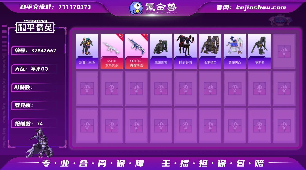 DYH18115【1粉装-6特效枪深海小丑鱼,暗影哥特,浪漫天命】有二次 苹果手Q-1粉装-6特效枪-49套装-74枪皮-0王牌印记-不朽星钻Ⅴ-20185热力值【1粉装】角色-智耀战神【6特效枪】Kar98K-巳巳如意[5级],ACE32-萌骑漫游[3级],DP-28-豹影疾电[4级],MG-36-幻彩电音[2级],M416-女娲灵识[3级],SCAR-L-青春物语[4级]【3稀有】深海小丑鱼,暗影哥特,浪漫天命【1飞行器】荒原烈焰飞行器【113其它衣服和枪皮】智谋强哥,SS32特训,元气之梦,风舞幻音,漫步者,缤纷果语,老实芭蕉,SS31特训,SS34特训,街头风暴,清新柠檬,粉恋花,阳光火鸡,红釉青花,SS35特训,SS33特训,迅捷龙虾,雏菊兔兔,狙击之神,蓝冰羽,巳巳如意,街头潮人,竞技名士,森林游猎者,特训学院,黄色运动,战术大师,雨过天青,紫幽梦,SS38特训,魅力单车,红色运动,薄荷星砂,海岛探路者,恋语绒绒,SS30特训,角色-唐三,SS37特训,鹰眼刺客,日照花林,角色-X,金羽特工,长空猛禽,夏日倾情,萝兰蝴蝶,SCAR-L-红色方程式,S1897-紫幽梦,PKM-紫幽梦,MG3-火熔核心,AKM-涂鸦街区,S1897-糯团青竹,R1895-雏菊兔兔,AA12-G-雨过天青,野牛-雏菊兔兔,AKM-龙的传人,MG3-幻世战舞者,M762-第五大道,UZI-影袭,MP5K-未来领航者,20-H-星途旅人,平底锅-雏菊兔兔,ARX-像素花束...