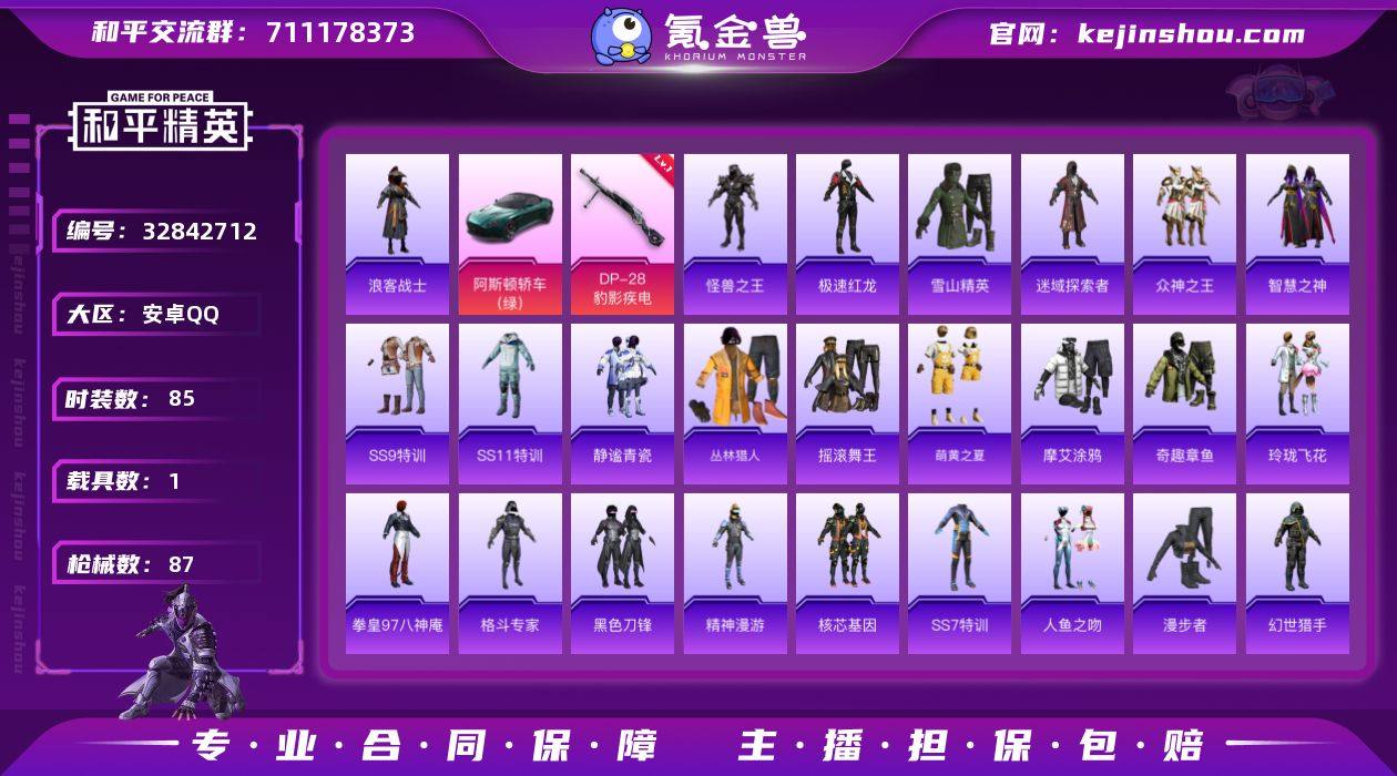 ZMH1375+【可二次 1载具-1粉装-1特效枪】安卓手Q-1载具-1粉装-1特效枪-85套装-87枪皮-0王牌印记-英勇黄金Ⅰ-26889热力值【1载具】阿斯顿·马丁DBS(绿)【1粉装】角色-女王【1特效枪】DP-28-豹影疾电[5级]【2稀有】UMP45-怪兽之王,S686-浪客战士【1飞行器】粉色滑翔尾迹【2背包】梦幻火箭背包,金曜白虎背包【168其它衣服和枪皮】幻世猎手,智慧之神,北国孤狼,格斗专家,SS11特训,冷焰舞者,原初圣火,深蓝色名流,漫步者,伏击者,迷域探索者,雪山征服者,传奇侦探,格斗先锋,众神之王,摇滚舞王,夏日音浪,竞技勇士朋克,黄色运动,牛气冲天,怒火燎原,迅猛虎鲸,SS7特训,战地菁英,摩艾涂鸦,甜蜜告白,幻影武者,深蓝冒险家,核芯基因,蓝色守护者,战地督导,金鼠迎春,西部风情,沙漠兵团,萌黄之夏,圣诞大吉,奇趣章鱼,SS13特训,骁骑迪迦,耀动青春,SS5特训,SS12特训,SS10特训,潮流先锋,熔岩使者,苍穹猎鹰,沙漠毒蛇,牛气满满,冰川特警,人鱼之吻,酷萌兔限定,精神漫游,SS8特训,静谧青瓷,迎春赐吉,SS9特训,治愈之星,科技之星,风行保卫者,甜蜜熊情侣,SS37特训,玲珑飞花,白色伏地魔,雪山精英,SS14特训,灰色格斗者,疯狂小兔子,凛冬战士,SS6特训,海滨突袭者,极速红龙,拳皇97八神庵,魅力单车,霓虹街区,白熊同盟,...
