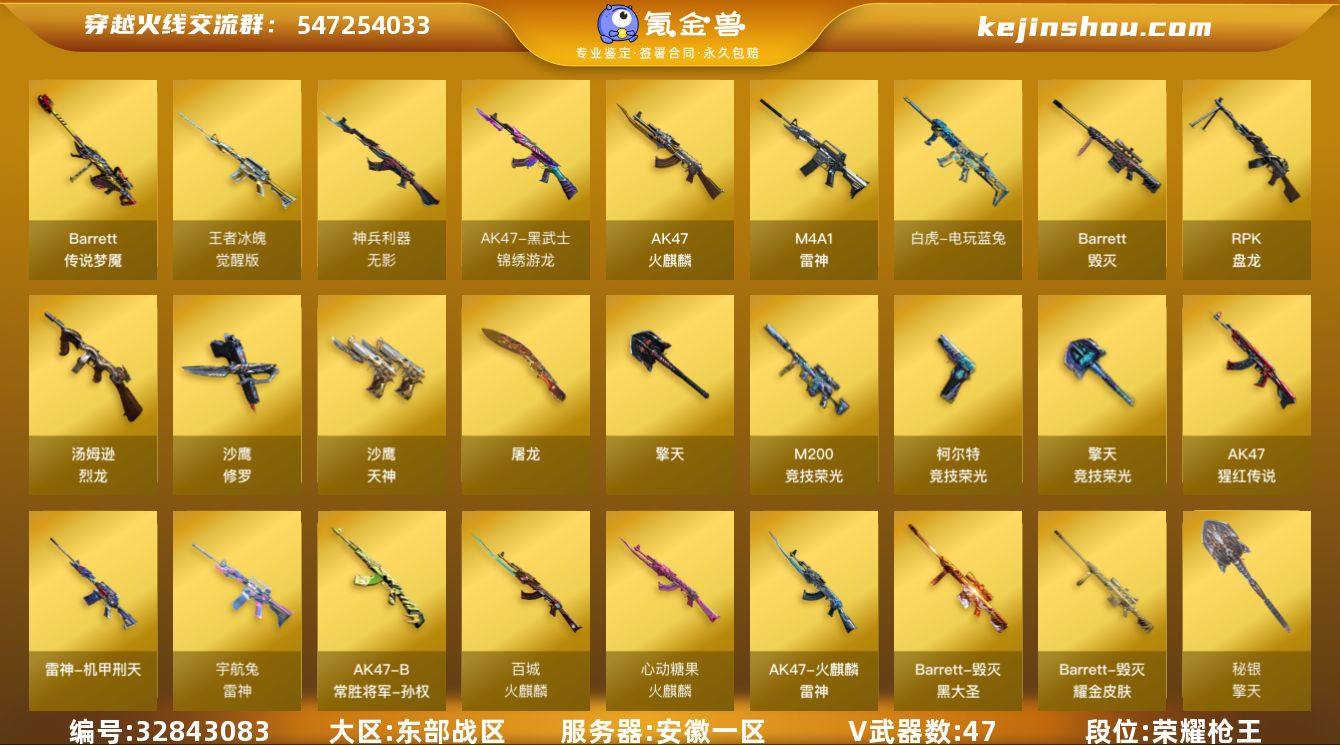 安徽一区-51V-2王者-0炫金 【传说武器】:传说梦魇 【热门武器】:传说梦魇,M200-竞技荣光,白虎-电玩蓝兔,汤姆逊-烈龙*6,RPK-盘龙*5,裁决-雪莉杨,USP-雷暴,沙鹰-修罗*2 【音效卡】:Barrett-碧霄极光音效卡 【皮肤】:汤姆逊-烈龙-末日皮肤*2,雷神-机甲刑天皮肤,雷神-宇航兔皮肤,雷神-源计划2.0专属 皮肤,火麒麟-雷神,火麒麟-百城,火麒麟-心动糖果,毁灭耀金皮肤,毁灭-黑大圣皮肤,毁灭-英雄计划 皮肤,AK47-B-常胜将军-孙权,炼狱-玩具枪皮肤,修罗-CF STAR,修罗-能量核心,天神-暗月,擎天-秘银 【角色】:魅影,雨棠,电竞教官-云悠悠,战地猎狐,王者葵-惊若翩鸿,芳心审判者,飞虎队-X,嘉年华灵狐,灵狐者-七夕宝贝,麻雀,曼陀罗-礼服,潘多拉-X,潘多拉-甜心教官,青霞仙子,蛇姬,斯沃特-X,铁骑荣耀,兔囡囡,樱-战斗天使 【人偶武器】:裁决-雪莉杨,天龙-曼陀罗,AWM-灵狐-15周年嘉年华,迷你裂空之翼*3,迷你波特博士*3,夺魂,迷你牛牛,迷你生化手雷,生化手雷-机甲核心,深渊终结者手雷*2,迷你超能女侍 【暴走生化】:超级对讲机 【挑战大师】:神圣爆裂者III,冰龙粉碎者-白马银枪*3,激光毁灭者III-白马银枪,VEPR-12-金魔,激光毁灭者III...