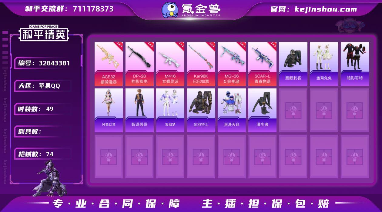 DYH18115【1粉装-6特效枪深海小丑鱼,暗影哥特,浪漫天命】有二次 苹果手Q-1粉装-6特效枪-49套装-74枪皮-0王牌印记-不朽星钻Ⅴ-20185热力值【1粉装】角色-智耀战神【6特效枪】Kar98K-巳巳如意[5级],ACE32-萌骑漫游[3级],DP-28-豹影疾电[4级],MG-36-幻彩电音[2级],M416-女娲灵识[3级],SCAR-L-青春物语[4级]【3稀有】深海小丑鱼,暗影哥特,浪漫天命【1飞行器】荒原烈焰飞行器【113其它衣服和枪皮】智谋强哥,SS32特训,元气之梦,风舞幻音,漫步者,缤纷果语,老实芭蕉,SS31特训,SS34特训,街头风暴,清新柠檬,粉恋花,阳光火鸡,红釉青花,SS35特训,SS33特训,迅捷龙虾,雏菊兔兔,狙击之神,蓝冰羽,巳巳如意,街头潮人,竞技名士,森林游猎者,特训学院,黄色运动,战术大师,雨过天青,紫幽梦,SS38特训,魅力单车,红色运动,薄荷星砂,海岛探路者,恋语绒绒,SS30特训,角色-唐三,SS37特训,鹰眼刺客,日照花林,角色-X,金羽特工,长空猛禽,夏日倾情,萝兰蝴蝶,SCAR-L-红色方程式,S1897-紫幽梦,PKM-紫幽梦,MG3-火熔核心,AKM-涂鸦街区,S1897-糯团青竹,R1895-雏菊兔兔,AA12-G-雨过天青,野牛-雏菊兔兔,AKM-龙的传人,MG3-幻世战舞者,M762-第五大道,UZI-影袭,MP5K-未来领航者,20-H-星途旅人,平底锅-雏菊兔兔,ARX-像素花束...