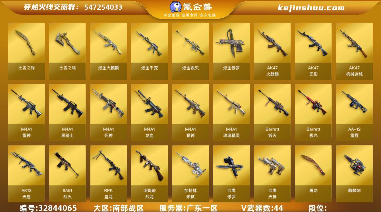 南部战区(广东一区)lb【生化号】41v【6烈龙+3修罗+死亡之眼,Barrett-金色蔷薇,Barrett-毁灭,M4A1-黑骑士,M4A1-雷神,Barrett-极光,屠龙,Colt1911-大黄蜂】2王者【王者之啸,王者之锋】5炫金【炫金火麒麟,炫金千变,炫金毁灭,炫金修罗】4角色【新海豹突击队,审判者,堕落女神,零】1音效【Barrett-毁灭音效卡】11皮【毁灭-荣耀之怒,屠龙-荣耀之锋,火麒麟-AG战队,毁灭-战神张飞,雷神-星空,火麒麟-CF STAR】 截图展示段位不代表实际段位 如赛季更新等不可抗拒因素发生变化、时限道具不保证所剩时间