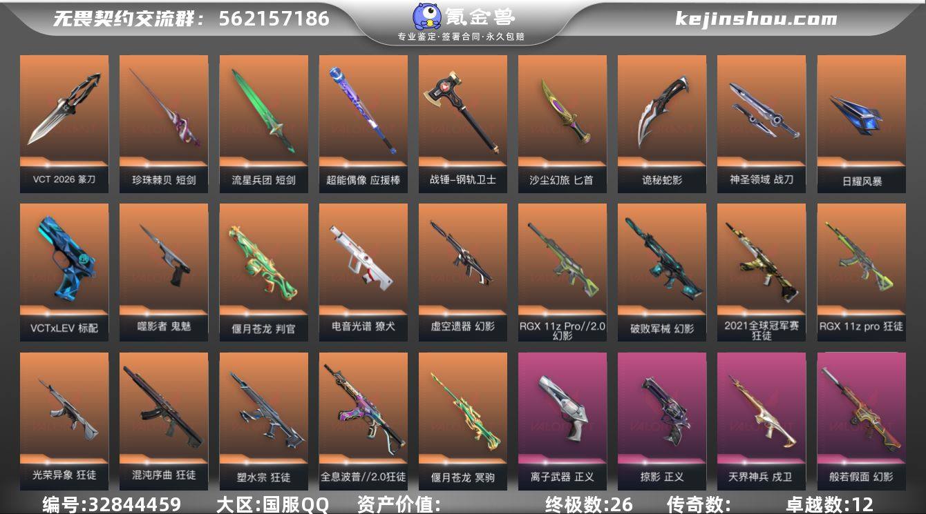 【4.8w库存VCT26纂刀.落英飞旋.紫金爪.剥皮小刀.21冠军AK.塑水宗.混沌.显卡.光荣异象.侦查.恶鬼.虚空.破败】YXy6343【无二次】【因赛季更新游戏段付以上号为准!】 【套装】:VCT 2026 赛季套装 【英雄】:幻棱,炼狱,维斯,暮蝶,钛狐,壹决,铁臂,捷风,雷兹,幽影,不死鸟,贤者,猎枭,蝰蛇,零,芮娜,奇乐,尚勃勒,霓虹,斯凯,夜露,星礈,K/O,海神,盖可,黑梦,钢锁 【近战武器】:近战武器-VCT 2026 篆刀,近战武器-剥皮小刀,近战武器-紫金爪刀,近战武器-落英飞旋,近战武器-珍珠棘贝 短剑,近战武器-流星兵团 短剑,近战武器-超能偶像 应援棒,近战武器-钢轨卫士 战锤,近战武器-沙尘幻旅 匕首,近战武器-诡秘蛇影 军刀,近战武器-神圣领域 战刀,近战武器-日耀风暴 遗器 【狂徒】:狂徒-2021全球冠军赛,狂徒-混沌序曲,狂徒-全息波普//2.0,狂徒-塑水宗,狂徒-RGX 11z Pro,狂徒-光荣异象,狂徒-盖亚的复仇,狂徒-海洋之星,狂徒-耀鳞威龙,狂徒-紫阙金琅,狂徒-超能偶像,狂徒-钢轨卫士,狂徒-流星兵团,狂徒-沙尘幻旅,狂徒-诡秘蛇影 【幻影】:幻影-破败军械,幻影-RGX 11z Pro//2.0,幻影-虚空遗器,幻影-般若假面,幻影-侦察力量,幻影-神中神罚,幻影...