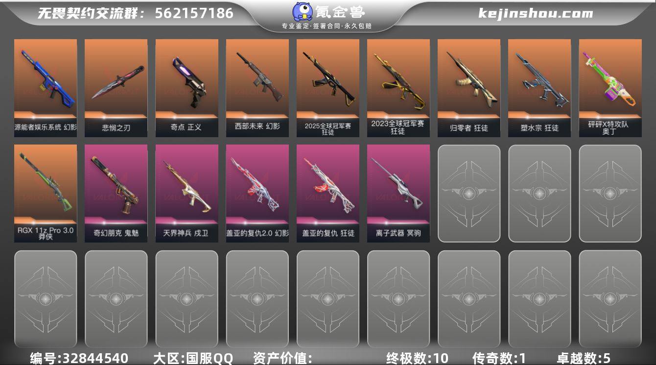 【精氪号】【怜悯之刃.23冠军AK.25冠军AK.塑水宗.盖亚.电玩.离子狙.奇点正义】YXy6432【无二次】【因赛季更新游戏段付以上号为准!】 【套装】:无畏契约季前邀请赛套装 【英雄】:幻棱,炼狱,维斯,暮蝶,钛狐,壹决,铁臂,捷风,雷兹,幽影,不死鸟,贤者,猎枭,蝰蛇,零,芮娜,奇乐,尚勃勒,霓虹,斯凯,夜露,星礈,K/O,海神,盖可,黑梦,钢锁 【近战武器】:近战武器-无畏契约季前邀请赛 悲悯之刃,近战武器-盖亚之怒 【狂徒】:狂徒-2025全球冠军赛,狂徒-2023全球冠军赛,狂徒-归零者,狂徒-塑水宗,狂徒-盖亚的复仇 【幻影】:幻影-西部未来,幻影-源能者娱乐系统,幻影-盖亚的复仇//2.0,幻影-西部未来 【戍卫】:戍卫-天界神兵 【冥驹】:冥驹-离子武器 【莽侠】:莽侠-RGX 11z Pro//3.0 【奥丁】:奥丁-砰砰X特攻队 【标配】:标配-超能偶像,标配-钢铁意志 【正义】:正义-奇点,正义-超限闪存,正义-沙尘幻旅,正义-纳米打击 【鬼魅】:鬼魅-奇幻朋克,鬼魅-数码咒术,鬼魅-星云暗涌 【短炮】:短炮-弧光异彩,短炮-天才少女 【卡面】:终章:激斗汉堡 卡面,进入射程 卡面,《双城之战》拥抱 卡面,精灵大战 卡面,欢迎来到底城 卡面,南瓜盛典 卡面,VCT...