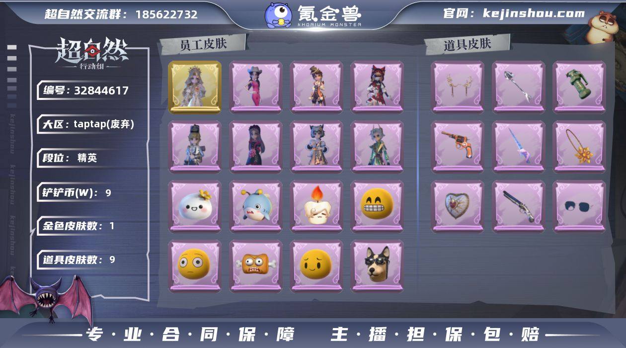 金色皮肤数量: 1 紫色皮肤数量: 6 道具皮肤数量: 9 段位: 精英 外观: 圣光之谕,王子与骑士,丝缕哀歌,霓裳踏雪,泽引山海,嘻嘻头套,呆滞头套,炙热烧烤,卑微头套,哈士奇头套,滑稽头套,鳄霸天头套,鱼头怪头套,面具马头套,萨卡班甲鱼头套,小鲨包包,未竟乐园,莓果陷阱,耀眼的你,庆宴绮愿,烛光纪念,牛啤背包,园丁鲨鲨头套,芝麻糊汤圆