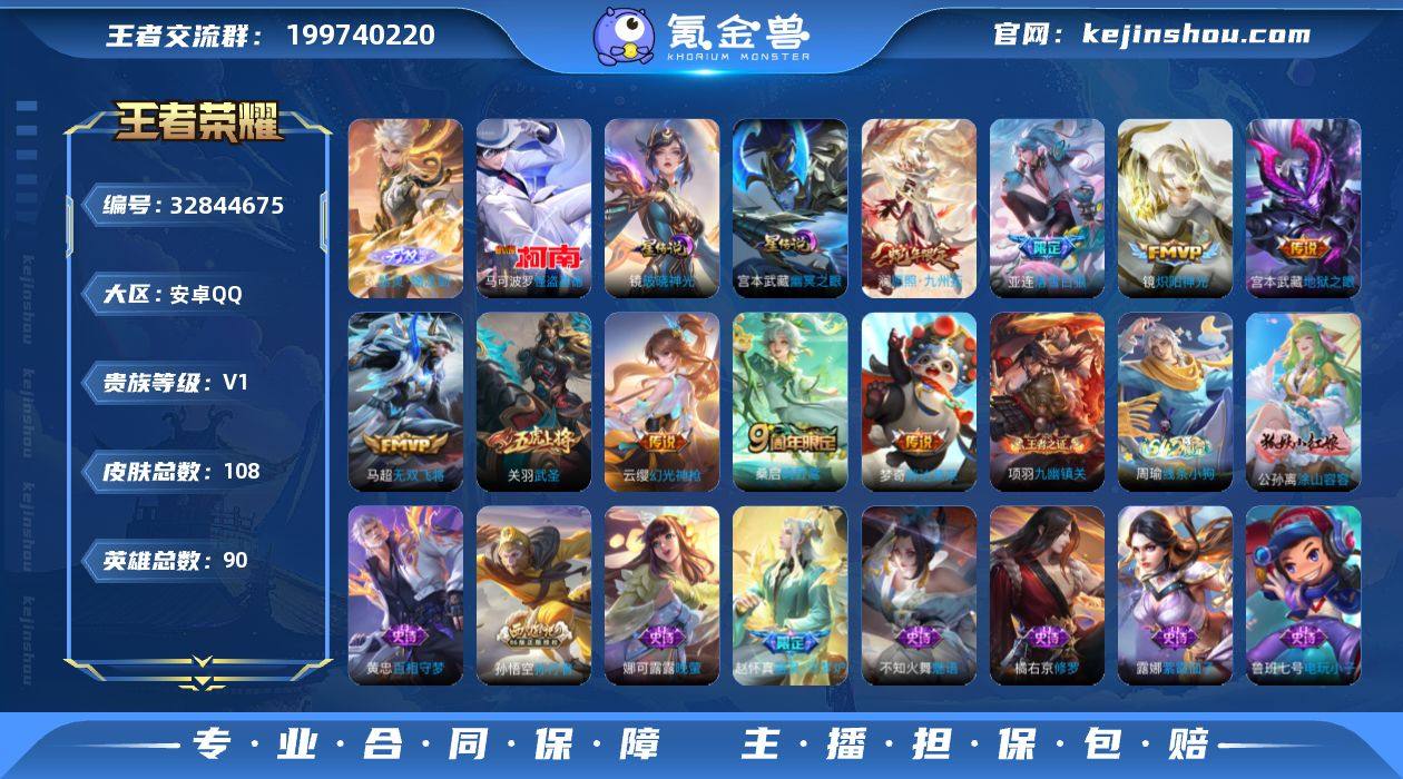 实名: 可修改 贵族等级: V1 英雄数: 90 皮肤数: 108 无双皮: 器灵·螭龙剑 珍品传说: 怪盗基德 星传说: 幽冥之眼,破晓神光 传说皮: 炽阳神光,地狱之眼,胖达荣荣,无双飞将,落雪白狼,幻光神枪 限定皮: 李小龙,武圣,美猴王,孙行者,鸣野蒿,愿照·九州拓 亮点: 安卓Q-V0-最强王者段位-90英雄-108皮肤-1无双-1珍品传说-9传说-39史诗【无双皮肤】:曜器灵螭龙剑【珍品传说】:马可波罗怪盗基德【传说皮肤】:澜愿照九州拓,云缨幻光神枪,桑启鸣野蒿,亚连落雪白狼,马超无双飞将,镜炽阳神光,关羽武圣,梦奇胖达荣荣,宫本武藏地狱之眼【限定皮肤】:姜子牙天穹之誓,狄仁杰阴阳师,赵云皇家上将,狄仁杰魔术师,项羽海滩派对,关羽武圣,孙悟空美猴王,孙悟空孙行者,李元芳云中旅人,干将莫邪胡桃夹子,百里玄策原初追逐者,裴擒虎李小龙,云中君纤云弄巧,鲁班大师探海日志,阿古朵江河有灵,张良古海寻踪,鬼谷子天穹祈灯,亚连落雪白狼,沈梦溪龙舞盛年,刘邦剑破天穹,程咬金群星魔术团,周瑜熔金海岸【年限皮肤】:孙悟空美猴王,澜愿照九州拓【赛季限定】:李元芳云中旅人,鲁班大师探海日志,张良古海寻踪,鬼谷子天穹祈灯,刘邦剑破天穹,姜子牙天穹之誓,东皇太一噬灭天穹...