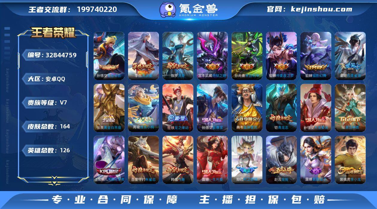 实名: 可修改 贵族等级: V7 英雄数: 126 皮肤数: 164 荣耀水晶: 全息碎影 传说皮: 黄金白羊座,猫影幻舞,云霓雀翎,末日机甲-孙尚香,仲夏夜之梦,地狱之眼 限定皮: 李小龙,游园惊梦,梁祝,龙胆,幽恒,时之彼端,飞衡,太华,天狼绘梦者,凤求凰,青龙志,朱雀志,至尊宝,一生所爱,大圣娶亲 亮点: 安卓Q-V7-至尊星耀V段位-126英雄-164皮肤-1典藏皮肤-8传说-50史诗【荣耀典藏】:孙悟空全息碎影【传说皮肤】:伽罗太华,貂蝉猫影幻舞,张良黄金白羊座,虞姬云霓雀翎,貂蝉仲夏夜之梦,李白凤求凰,孙尚香末日机甲,宫本武藏地狱之眼【限定皮肤】:白起狰,狄仁杰阴阳师,虞姬凯尔特女王,赵云皇家上将,赵云龙胆,妲己时之彼端,嬴政白昼王子,鲁班七号狮舞东方,庄周蜃楼王,高渐离死亡摇滚,阿轲迷踪丽影,孙膑妖精王,扁鹊炼金王,芈月重明,吕布猎兽之王,周瑜赤莲之焰,夏侯惇朔风刀,甄姬幽恒,甄姬游园惊梦,曹操烛龙,典韦蓝屏警告,狄仁杰魔术师,狄仁杰万华元夜,项羽海滩派对,老夫子醍醐杖,露娜一生所爱,刘邦夺宝奇兵,韩信飞衡,兰陵王驯魔猎人,孙悟空至尊宝,孙悟空大圣娶亲,牛魔御旌,李元芳银河之约,钟馗神迹守卫,女娲朔望之晖,蔡文姬繁星吟游,太乙真人饕餮,鬼谷子...