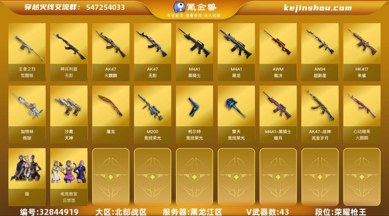黑龙江区-45V-1王者-0炫金 【热门武器】:HK417-朱雀,M200-竞技荣光,M4A1-黑骑士,加特林-炼狱,USP-雷暴 【皮肤】:火麒麟-心动糖果,黑骑士-暗月,战神-流金岁月皮肤 【角色】:瞳,电竞教官-云悠悠,乔伊教练,风暴女,虎妞,嘉年华灵狐,娟娟,灵动武士,龙儿,潘多拉-甜心教官,斯沃特-X,铁骑荣耀,新娜塔莎 【人偶武器】:AWM-灵狐-15周年嘉年华,生化手雷-机甲核心 【暴走生化】:超级对讲机 【挑战大师】:神圣爆裂者-末日III 【英雄级武器】:AK47-火麒麟,M4A1-黑龙*2,M4A1-黑骑士,AK47-无影,AN94-超新星,HK417-朱雀,无影-神兵利器,王者之烈-觉醒版,AWM-裁决,M200-竞技荣光,加特林-炼狱,沙鹰-天神*2,USP-雷暴,柯尔特-竞技荣光,屠龙,擎天-竞技荣光,高爆手雷-竞技荣光*7,闪光弹-竞技荣光*7,烟雾弹-竞技荣光*8 【道具】:CFS限定背包,绿色巨人,灵魂忍者,迷雾幽灵,夺命之镰,防化服*2,金色流光-枪王排位*2,星辰流光-枪王排位,枪王排位28赛季金色流光,云海游龙表情,防弹头盔*5,防弹衣*5,C4工具钳*5,手雷包*5 【特殊枪械】:1黑骑士,1炼狱