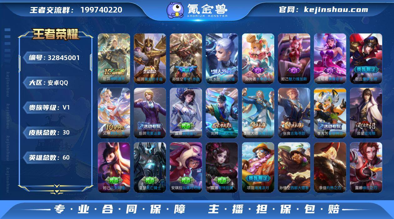 安卓Q-V0-荣耀黄金IV段位-60英雄-30皮肤-3传说-5史诗【传说皮肤】:后羿神树通天,孙悟空零号赤焰,后羿黄金射手座【限定皮肤】:赵云皇家上将,项羽海滩派对,花木兰默契交锋,孙悟空零号赤焰,弈星混沌棋,鲁班大师探海日志,张良古海寻踪,鬼谷子天穹祈灯,刘邦剑破天穹【赛季限定】:弈星混沌棋,鲁班大师探海日志,张良古海寻踪,鬼谷子天穹祈灯,刘邦剑破天穹【史诗皮肤】:花木兰默契交锋,妲己魅力维加斯,孙尚香水果甜心,王昭君偶像歌手,赵云皇家上将【其他皮肤】:艾琳鹤鸣心笺,刘邦剑破天穹,鬼谷子天穹祈灯,后羿完美运算,张良古海寻踪,李元芳妄想特派,鲁班大师探海日志,露娜瓷语鉴心,弈星混沌棋,亚瑟死亡骑士,妲己少女阿狸,安琪拉玩偶对对碰,露娜哥特玫瑰,项羽海滩派对,瑶森,李信灼热之刃,后羿精灵王,孙悟空西部大镖客,花木兰剑舞者,露娜绯红之刃,高渐离金属狂潮,鲁班七号福禄兄弟【营地ID】:1846287934