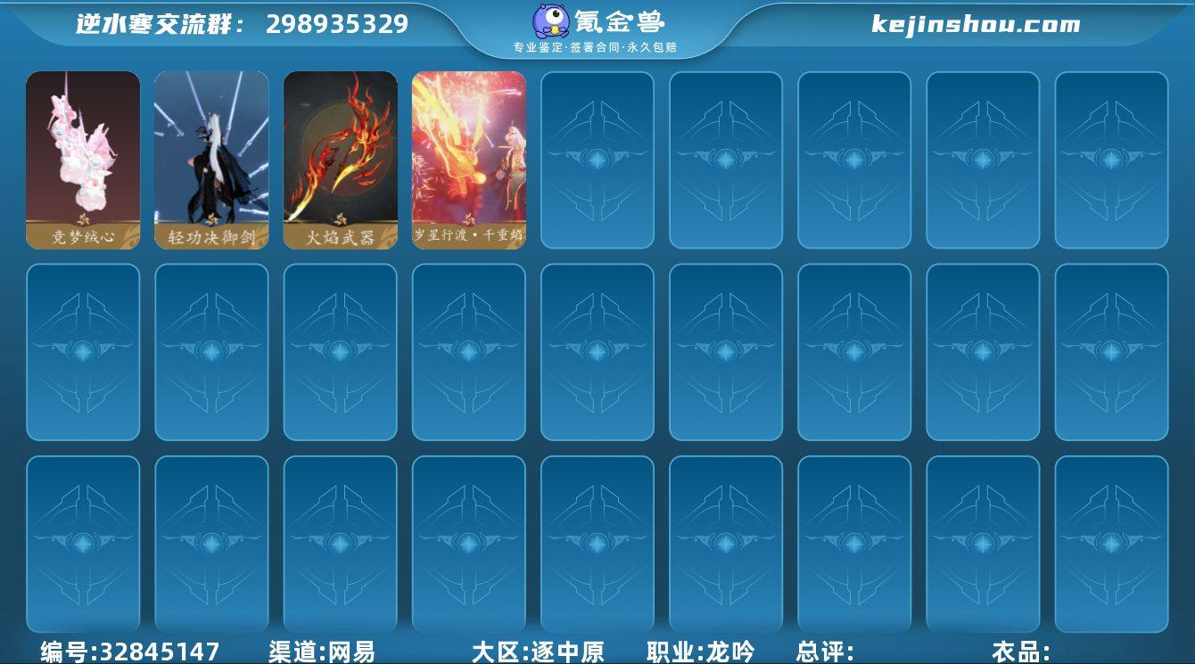 【区服】 挑灯看剑 【充值称号】 凭栏听雨 【已用天赏石】 8 【天霓染数量】 2 【天霓染】 陆离*1, 霜寒*1 【天赏发型】 蔚海 【天赏外观】 火焰武器, 轻功诀御剑, 岁星行渡·千重焰 【商城外观】 蕉雨夜澜, 真嗣款战斗服, 纯白月光, 千星咏叹, 焦糖暖绒, 跃动心芒, 羽信絮梦, 琼林萧瑟, 晴蓝逸思, 玄喵夜行, 贪狼摄星, 青林雀舞, 开阳执戈, 衣香鬓影, 混天焚莲, 逆鳞浊日, 赤狐魅语, 天纵恒尊, 白灵幻尘, 墨隐千秋, 枫华九霄, 御宇临渊, 暮云苍野 【祥瑞坐骑】 风行·江湖景, 纵风甲车·赤, 骋风叱焰, 风行·万灯明, 云螭·探宇寻寰, 粉黛娇, 呆宝, 沉木行马, 贺岁喜狮, 布丁, 龙衔瑞焰, 伯力, 咩郎, 瓜皮, 墨流云·玄色, 墨流云·靛青, 奔虹赤, 银砂素波, 玉霄飞练, 隐云涧 【灵韵内功】 鸣沙诀 【铜币数量】 59329