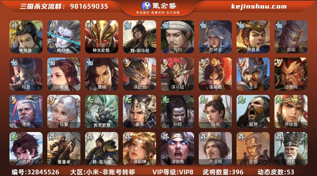 VIP等级: VIP8 官阶: 大将军 武将数量: 396 动态皮肤数量: 53 神将: 神甘宁,神陆逊,神太史慈 魏国武将: 曹纯,曹婴,程昱,郝昭,界曹真,界钟会,马钧,魏-司马昭 蜀国武将: 花鬘,谯周,沙摩柯,王平,诸葛瞻,谋马超,谋赵云 吴国武将: 贺齐,界徐盛,留赞,骆统,孙皓,吴景,势太史慈 群国武将: 卑弥呼,陈登,杜预,公孙康,界左慈,沮授,祢衡,南华老仙,麹义,苏飞,兀突骨,许攸,张琪瑛,张让,郑玄,左慈,界沮授,谋张角,谋貂蝉,群-司马昭,星董卓 亮点: 【14789871】渠道12357二等大将军:势太史慈,动态神甘宁,界沮授,谋貂蝉,南华老仙,张琪瑛,界徐盛,界左慈,杜预,马钧,神太史慈,动态神陆逊,司马昭,动态许攸,诸葛瞻,郝昭,界钟会,界曹真,程昱,曹婴,曹纯,王平,谋马超,谋赵云,花鬘,沙摩柯,谯周,骆统,吴景,贺齐,孙皓,留赞,左慈,谋张角,沮授,张让,麹义,苏飞,陈登,公孙康,兀突骨,祢衡,郑玄,星董卓,卑弥呼等55史诗。排位武将133。包裹:史诗宝珠31、手气卡290、羽毛9700、将魂4400、心愿积分4600、金票21000。渠道:小米、安卓手机均可玩,可以换绑,账号包赔包回收,游戏内玩家互通。