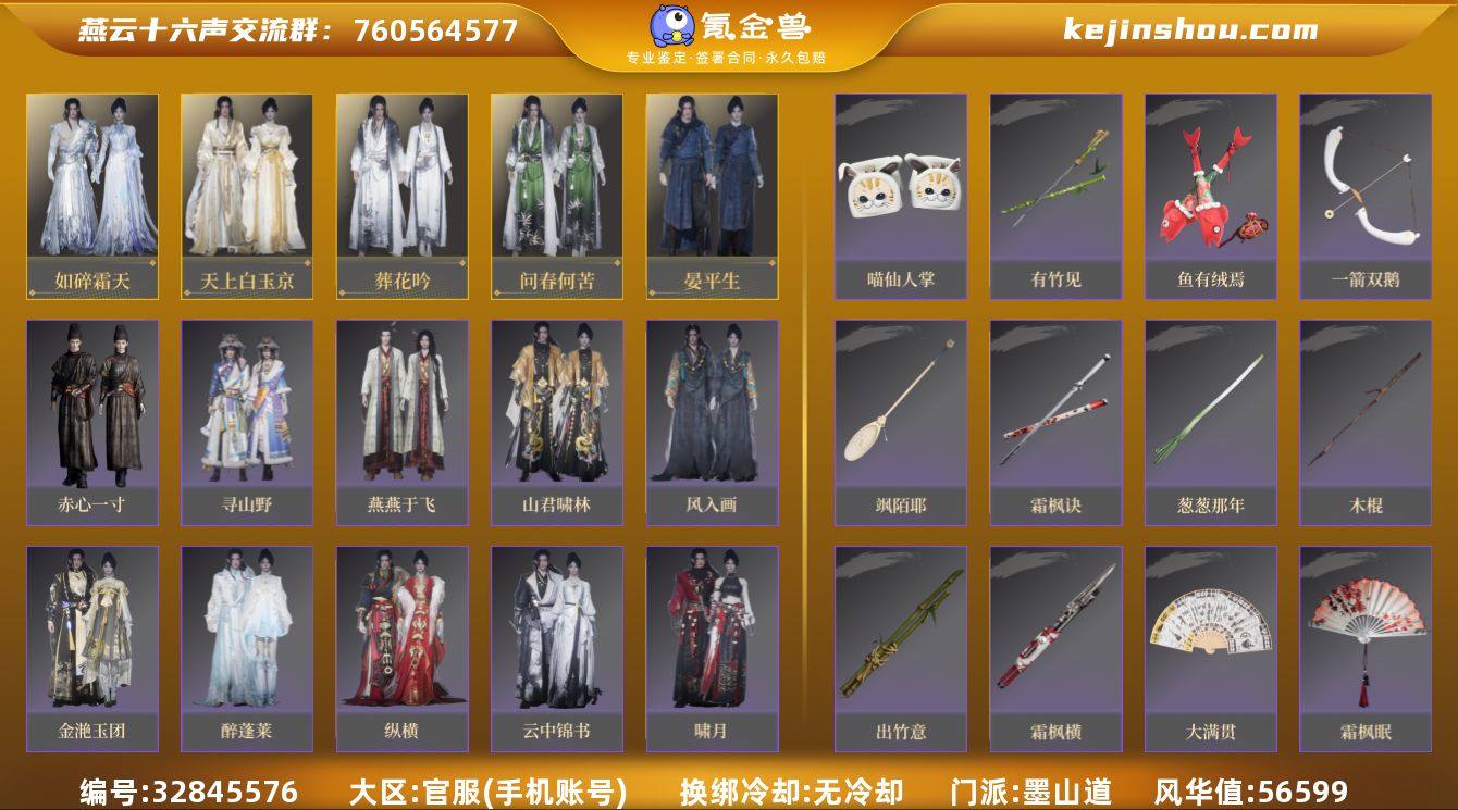 加永劫无间pc端连体号 30w收藏值白送 6个赛季限定红皮 白玉京,碎冰冰,万顷琉璃,醉蓬莱,万剑归宗,一颗未使用八音有三套六重心法,三套武学均小毕业,如意值80%