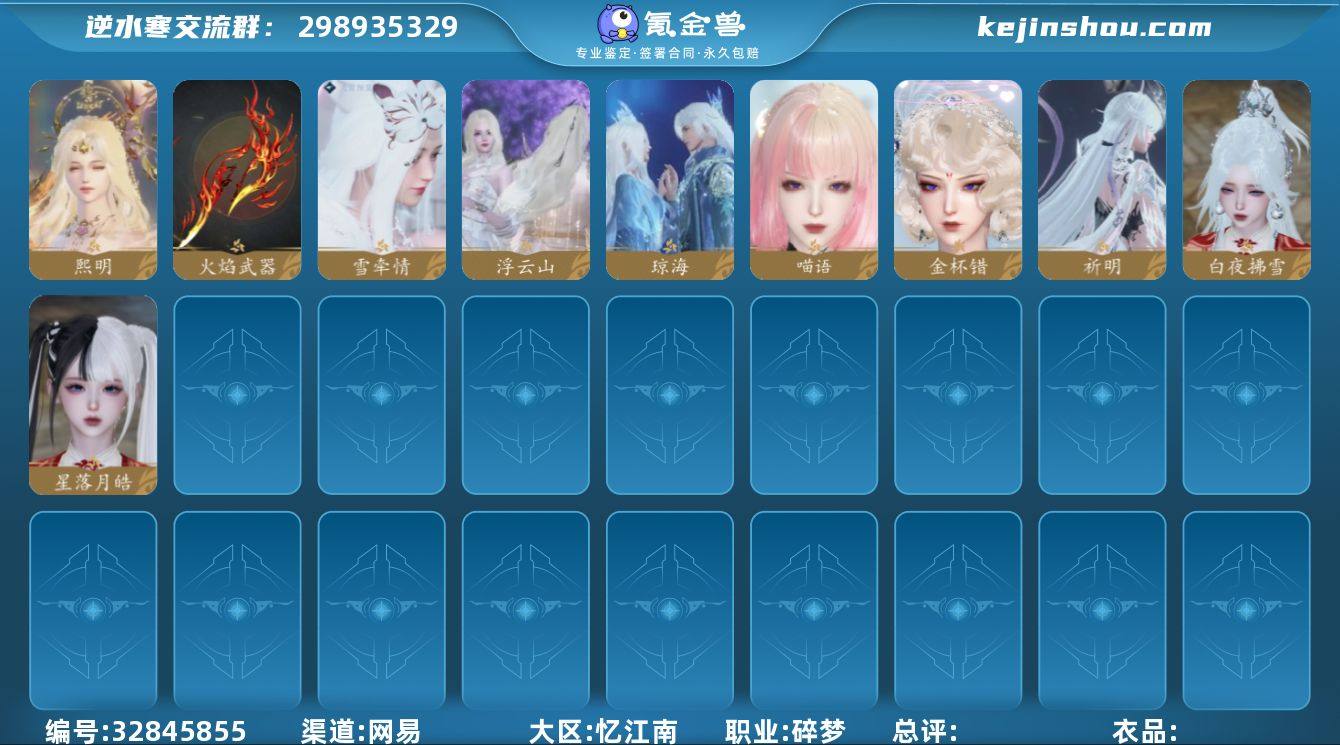 【区服】 烟雨江南 【战力值】 190.61 【职业】 碎梦 【馆藏】 6级 【衣品值】 256175 【国色值】 113570 【已用天赏石】 20 【天霓染数量】 6 【充值称号】 把酒临风 【累计充值】 40973元 【天霓染】 逸夏浮澜*1, 炽情私语*1, 野月*1, 无常白袍*1, 星落月皓*1, 古道西风*1 【灵韵内功】 断金戈, 破霄摧星, 鸣沙诀, 荡剑扬波, 昆吾断玉, 汲川, 定锋 【副本外观】 白夜拂雪*2, 星落月皓, 重海遥思, 霜途无间, 飞焰流波, 紫宿宸极 【天赏外观】 琼海, 浮云山, 雪牵情, 喵语, 金杯错, 祈明, 熙明, 火焰武器 【祥瑞坐骑】 呆宝, 萌莓, 露荷, 布丁, 假面, 鸿火, 喜多, 风行·江湖景, 风行·世间情, 风行·万灯明, 云螭·封冰怀雪, 龙衔瑞焰, 花仙鼠鼠, 甜点鼠鼠, 金冠鼠鼠, 纵风甲车·玄, 纵风甲车·赤, 粉黛娇, 幻琉晶, 狂霸天, 沉木行马, 星河转·银昼, 星河转·金夕, 星河转·赤夜, 骋风叱焰, 抟乌镇妖, 贺岁喜狮, 伯力, 咩郎, 瓜皮, 英杰, 霸霸, 墨流云·玄色, 墨流云·朱红, 墨流云·靛青, 奔虹赤, 踏星夜, 彩虹小马, 赤兔, 犬威哮月, 银砂素波, 犬威哮月·沧, 犬威哮月·焰, 腾云逐日, 花花团子, 竹青团子, 梅香团子, 绒绒夜, 牛奶酥, 隐云涧, 玉霄飞练, 四方游士, 侠道游, 空山闲, 纸鹤·...