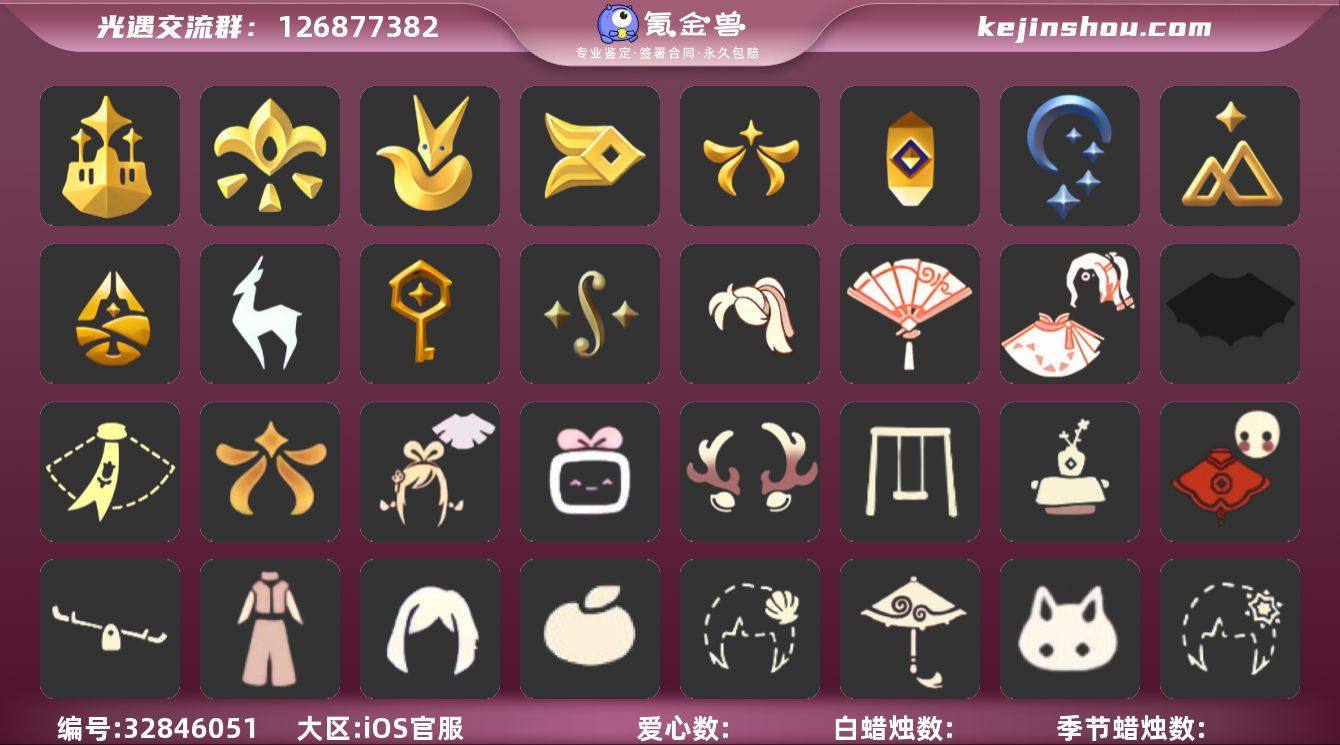 账号类型: 手机账号 季节已毕业: 梦想季,小王子季,风行季,欧若拉季,集结季,夜行季,追忆季,拾光季,归巢季,九色鹿季,筑巢季,二重奏季 完成地图: 晨岛,云野,雨林,霞谷,暮土,禁阁,全图毕业 珍稀物品: 透明蝶翼斗,玫瑰花 礼包: 蝙蝠套,围巾,欧若拉之翼,绊爱,大铁头,鹿角,秋千,茶桌,福娃,跷跷板,奔跑裤子,奔跑发型,橘子,贝壳,红伞,兔子,雪花,彩虹耳钉,蝴蝶结,暗彩装扮,新年耳钉,衔福献瑞礼包,献瑞折扇礼包,宝骏丹心马尾礼包 裤子: 武士裤,背带裤,白棉裤,搓澡巾 面具: 黄鼠狼,红狐狸 面饰: 红耳机,黑框眼镜 项链: 围巾 发型: 蝴蝶结,正太,樱花,公主头,虚荣,猫耳 头饰: 花环 斗篷: 白金,红金,白鸟斗,花瓣斗篷,荧蓝斗篷 配饰: 雨伞,排箫,高音钢琴,吉他,笛子,大铃铛乐器,乐器 亮点: 重塑药水141