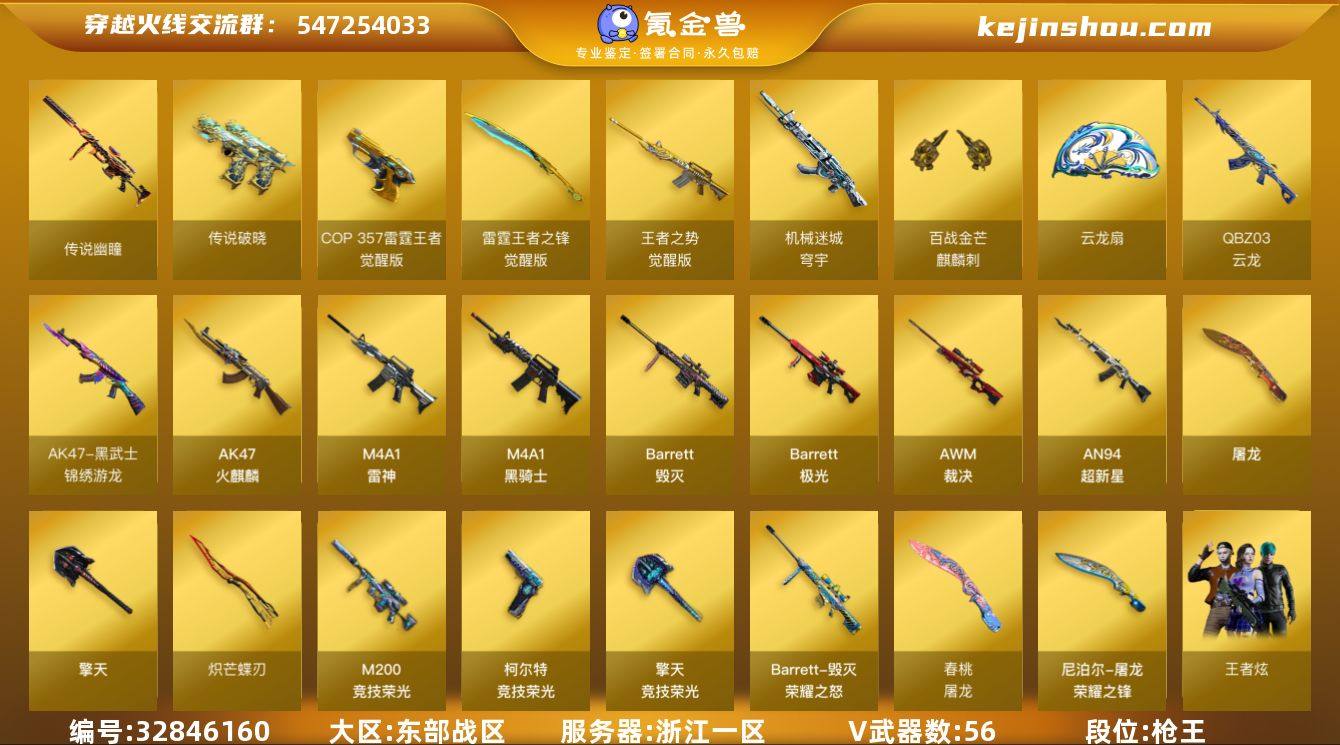 【ky6552】浙江一区-63V-8王者武器数-0炫金武器数 【传说武器】:传说幽瞳,传说破晓 【热门武器】:传说幽瞳,传说破晓,M200-竞技荣光,死亡之眼,金色小号,C.A.T,M4A1-黑骑士,裁决-雪莉杨,炽芒蝶刃 【王者炫金武器】:王者之魄闪光弹,高爆手雷-雷霆王者 【皮肤】:裁决-星际旅行 皮肤,雷神-源计划2.0专属 皮肤,M4A1-再燃火线,毁灭-荣耀之怒,毁灭-百城浙江 皮肤,毁灭-虹光风暴 皮肤,毁灭-秦师 皮肤,毁灭-英雄计划 皮肤,黑骑士-破界 皮肤,极光-能量核心,屠龙-荣耀之锋,屠龙-春桃 皮肤 【角色】:电竞教官-云悠悠,零·纪元,战地猎狐,王者炫,奇洋探员,乔伊教练,修道士,葵-阿尔法武装,幻面灵狐,暗夜-X,电竞少女,芳心审判者,飞虎队-X,风暴女*2,灵狐者-X,麻雀,曼陀罗-X,潘多拉-X,潘多拉-甜心教官,潜龙队-X,青霞仙子,斯沃特-X,维纳斯,新娜塔莎,夜玫瑰-宠粉,影武者-X,游珑儿,潘多拉-N 【人偶武器】:裁决-雪莉杨,C.A.T 【暴走生化】:死亡之眼 【英雄级武器】:AK47-火麒麟,M4A1-雷神*2,M4A1-黑骑士,AN94-超新星,QBZ03-云龙,黑武士-锦绣游龙,超新星-热带奇洋,王者之势-觉醒版,机械迷城-穹宇,天罚-斗烈龙驹,Barrett-毁灭,Barr...