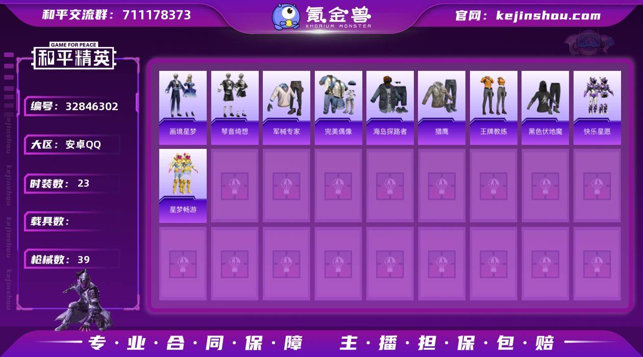 安卓 手Q-0粉装-3特效枪-0载具-0粉色飞行器-9028热力值-1王牌印记-23套装-39枪皮 【粉色枪皮等级】:AKS-74U-森灵之息(五级),Mk14-福马献瑞(五级),AA12-G-萌骑幻想(三级) 【粉色枪皮】:AKS-74U-森灵之息,Mk14-福马献瑞,AA12-G-萌骑幻想 【粉色降落伞】:星之彼岸降落伞 【稀有套装】:套装-马上有钱,套装-迅捷龙虾,套装-画境星梦,套装-琴音绮想,套装-雨过天青,套装-红釉青花 【稀有枪皮】:AKM-星之彼岸,SCAR-L-夜灯,M416-糯团青竹,AUG-耀粉歌者,蜜獾-天降萌叽,ACE32-画境星梦,UMP45-夜灯,汤姆逊-像素花束,MP5K-画境星梦,M24-炫彩节奏,VSS-星之彼岸,M1加兰德-画境星梦,S12K-夜灯,AA12-G-画境星梦,M249-星之彼岸,平底锅-画境星梦 【其他套装】:套装-军械专家,套装-完美偶像,套装-海岛探路者,套装-猎鹰,套装-王牌教练,套装-黑色伏地魔,套装-快乐星愿,套装-星梦畅游 【稀有背包】:深海小丑鱼背包(2级) 【营地ID】:1031065052