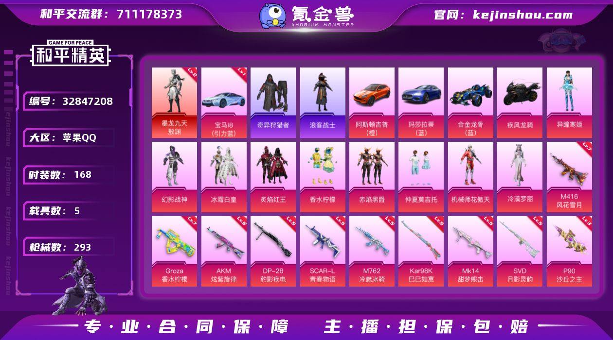 苹果 手Q-1神装-10粉装-14特效枪-5载具-9粉色飞行器-98339热力值-16王牌印记-168套装-293枪皮 【红色载具】:宝马i8(引力蓝)(一级) 【红色神装等级】:墨龙九天-敖渊(二级) 【红色角色神装】:墨龙九天-敖渊 【热门品类】:套装-小丑鱼,套装-奇异狩猎者,角色-军刀雅典娜,套装-浪客战士,套装-龟仙人,大砍刀-青龙偃月刀 【粉色套装】:粉装-幻影战神,粉装-冰霜白皇,粉装-炙焰红王,粉装-香水柠檬,粉装-赤焰黑爵,粉装-仲夏莫吉托,粉装-机械师花傲天,角色-冷漠罗丽,角色-异瞳寒姬,角色-水中影 【粉色枪皮等级】:AKM-炫紫旋律(六级),SCAR-L-青春物语(五级),M416-风花雪月(七级),GROZA-香水柠檬(七级),M762-冷魅冰骑(五级),UMP45-萌骑冒险(四级),P90-沙丘之主(三级),Kar98K-巳巳如意(五级),Mk14-盛世惊鸿(三级),Mk14-甜梦熊击(五级),Mk14-福马献瑞(五级),SVD-月影灵韵(五级),DP-28-豹影疾电(五级),PKM-萌骑夺宝(一级) 【粉色载具】:宝马i8(引力蓝),阿斯顿马丁DBX(橙),玛莎拉蒂Ghibli(蓝),合金龙骨(蓝),疾风龙骑 【粉色枪皮】:AKM-炫紫旋律,SCAR-L-青春物语,M416-风花雪月,GROZA-香水柠檬,M762-冷魅冰骑,UMP45-萌骑冒险,P90-沙丘之...