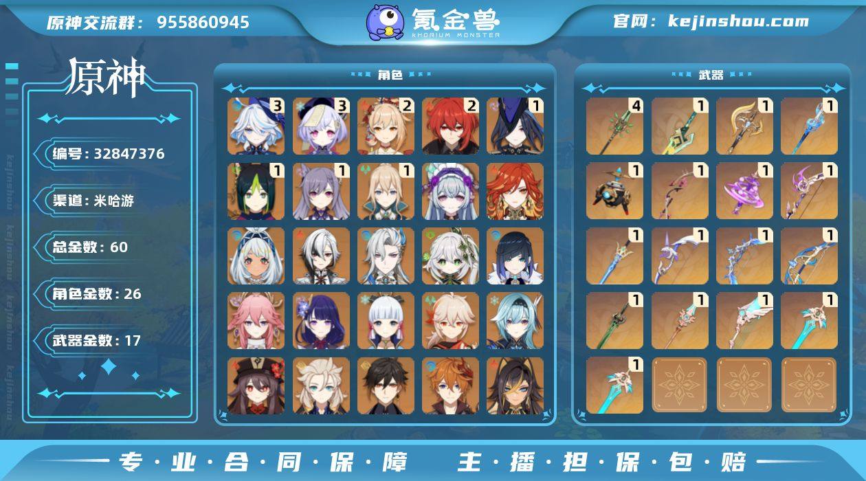 原神官服成品号,芙宁娜90级满命(六星),五星角色超多,专武齐全,含“最初的大魔术”等强力武器,武器总数305把,摩拉110万+!本人实名账号,支持换绑,安全可验。诚心出售400元,可小刀8.88,交易走平台不退不换,