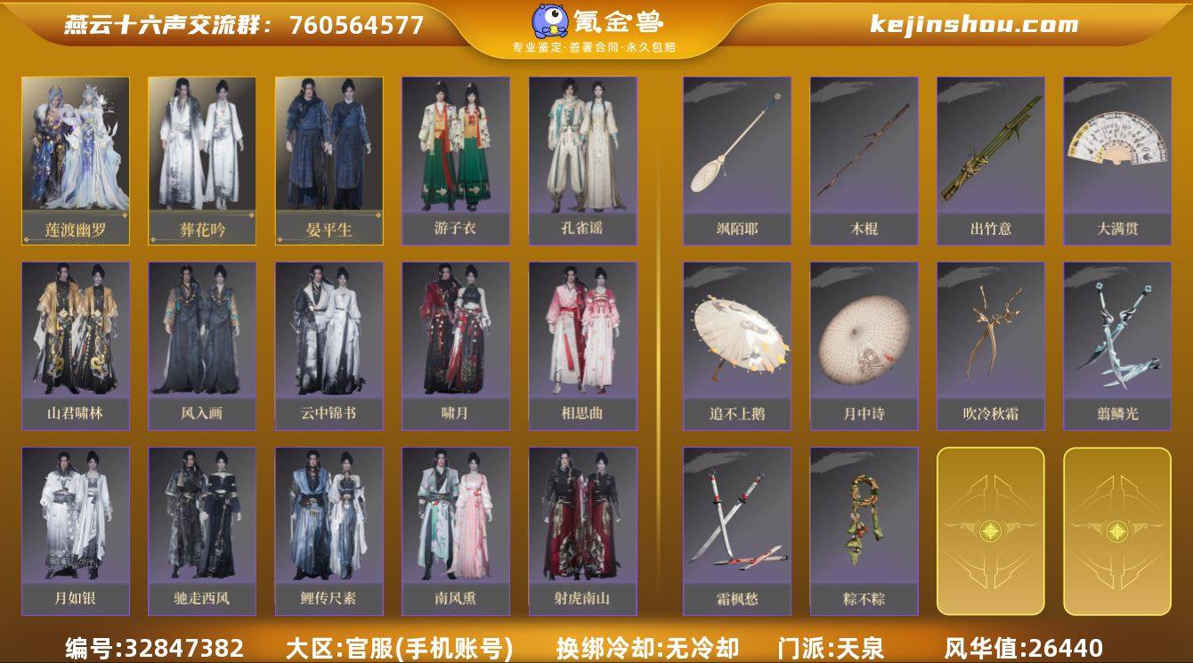 【已用八音窍3(不含染色)】,可小刀,累充865rmb, 等级100, 风华值26440, 武林造诣3.672鹅, 套装3金23紫, 载具2, 清河5级, 开封4级, 河西4级, 不见山2级