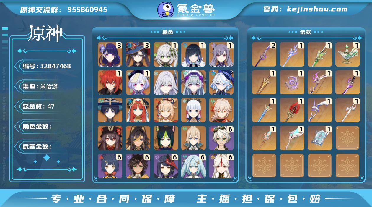 【原神】冒险等级:59,五星数量:35,五星角色:雷电将军 * 3命,莫娜 * 3命,迪卢克 * 1命,刻晴 * 1命,七七 * 1命,夜兰 * 1命,纳西妲 * 1命,琴,神里绫华,宵宫,迪希雅,梦见月瑞希,芙宁娜,提纳里,丝柯克,妮露,流浪者,枫原万叶,胡桃__五星武器:薙草之稻光 * 2精,苍耀,裁叶萃光,阿莫斯之弓,不灭月华,苍古自由之誓,飞雷之弦振,风鹰剑,护摩之杖,四风原典,天空之脊,天空之翼,雾切之回光,圣显之钥,千夜浮梦__四星角色:班尼特 * 6命,九条裟罗 * 6命,香菱 * 6命,珐露珊 * 6命,凝光 * 6命,迪奥娜 * 6命,早柚 * 6命,赛索斯 * 6命,行秋 * 5命,柯莱 * 5命,芭芭拉 * 5命,辛焱 * 5命,罗莎莉亚 * 5命,夏沃蕾 * 5命,久岐忍 * 4命,烟绯 * 4命,雷泽 * 4命,夏洛蒂 * 4命,莱依拉 * 3命,坎蒂丝 * 3命,托马 * 3命,琳妮特 * 3命,嘉明 * 3命,塔利雅 * 3命,砂糖 * 2命,绮良良 * 2命,卡维 * 2命,菲米尼 * 2命,卡齐娜 * 1命,瑶瑶 * 1命,云堇 * 1命,重云 * 1命,诺艾尔 * 1命,北斗 * 1命,奇偶·女性,鹿野院平藏,米卡,多莉,五郎,伊法
