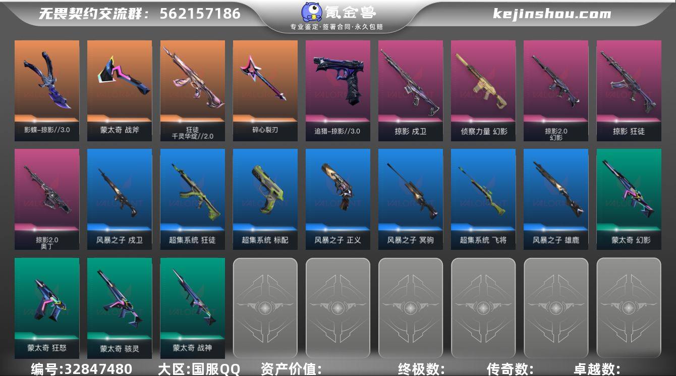Q194067 (掠影//3.0套装)无畏契约/96级/未定级/22英雄/33皮肤/资产16890/已使用R点390/剩余R点10/掠影//3.0-追猎,影蝶,蒙太奇-战斧,无畏契约季前邀请赛-悲悯之刃,碎心裂刃,千灵华绽//2.0-狂徒,掠影//2.0-幻影,侦察力量-幻影,掠影-戍卫,掠影-狂徒,掠影//2.0-奥丁