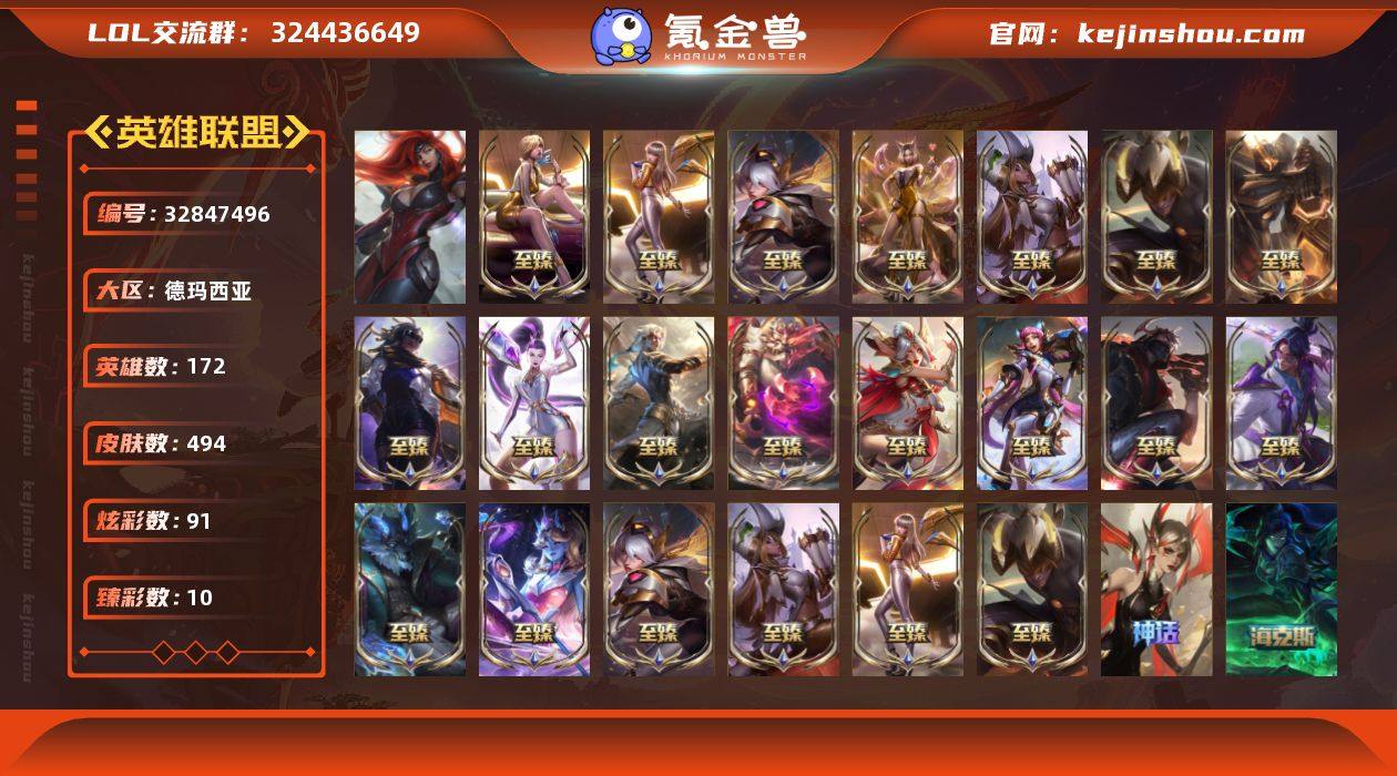 【龙瞎】未定级段位-172英雄-494皮肤-91炫彩-1终极-31神话-94限定-64传说-108史诗 【神话皮肤】:十周年纪念安妮,源代码乐芙兰,殿堂传奇乐芙兰,神凰行者瑞羽圣凰艾尼维亚,灰烬骑士派克,海克斯科技雷克顿,摄魂使者薇恩,至臻真实伤害赛娜,至臻北极星使者沃里克,至臻黑夜使者凯隐,至臻黑夜使者李青,至臻黑夜使者李青2022,至臻幻灵战斗猫金克丝,至臻KDA阿狸,至臻KDAALLOUT卡莎,至臻KDA卡莎,至臻KDA卡莎2022,至臻KDA伊芙琳,至臻灵魂莲华易,至臻魅惑女巫厄运小姐,至臻魅惑女巫厄运小姐2022,至臻神凰行者烈羽焰凰霞,至臻神龙尊者均衡之龙沃利贝尔,至臻太空律动魔音海妖娜美,至臻王国机神玄武盖伦,至臻西部魔影猎天使恶魔泰隆,至臻源计划正义艾瑞莉娅,至臻源计划正义艾瑞莉娅2022 【珍稀头像】:红包头像 【热门头像】:卡特琳娜的匕首头像,勇者阿狸头像,永恒之森霞头像 【至臻皮肤】:至臻灵魂莲华易,至臻北极星使者沃里克,至臻魅惑女巫厄运小姐,至臻魅惑女巫厄运小姐(2022),至臻KDA伊芙琳,至臻源计划正义艾瑞莉娅,至臻源计划:正义艾瑞莉娅(2022),至臻暗裔英雄嘉文四世,至臻黑夜使者李青,至臻黑夜使者李青(2022),至臻王国机神玄武盖伦,至臻...
