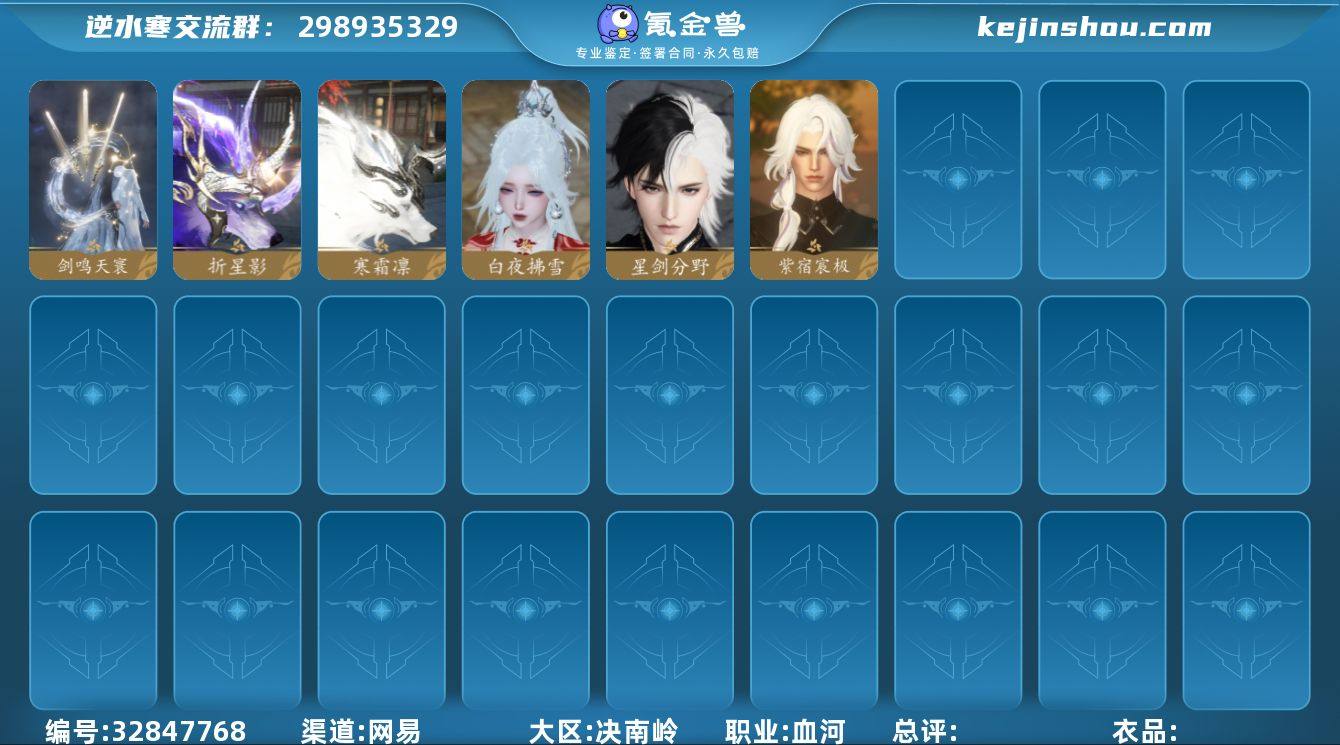 血河【把酒临风】【已用天赏石19】天霓染1, 天赏发型7, 副本外观5, 馆藏5级, 灵韵20, 9国色, 288300衣品, 72890国色值, 237套时装, 详情见图