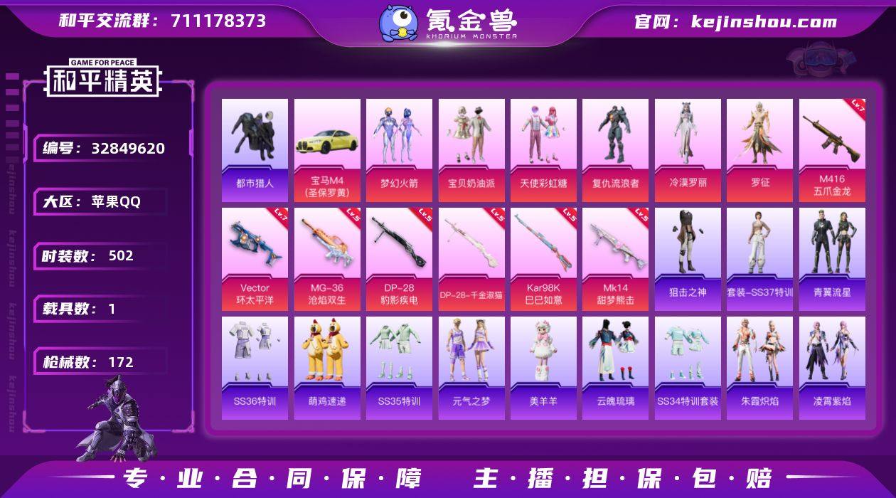 实名: 可修改 时装数: 502 载具数: 1 枪械数: 172 战备数: 127 热门装扮: 梦幻火箭(新101),呆萌铁蟹,宝贝奶油派,天使彩虹糖,迅捷狂鲨,鹰眼刺客,都市猎人,复仇流浪者,冷漠罗丽,罗征 载具: 宝马M4(圣保罗黄) 稀有枪皮: M416五爪金龙,Vector环太平洋,DP-28-千金淑猫,Kar98K-巳巳如意,MK14-甜梦熊击,DP-28-豹影疾电,MG-36-沧焰双生