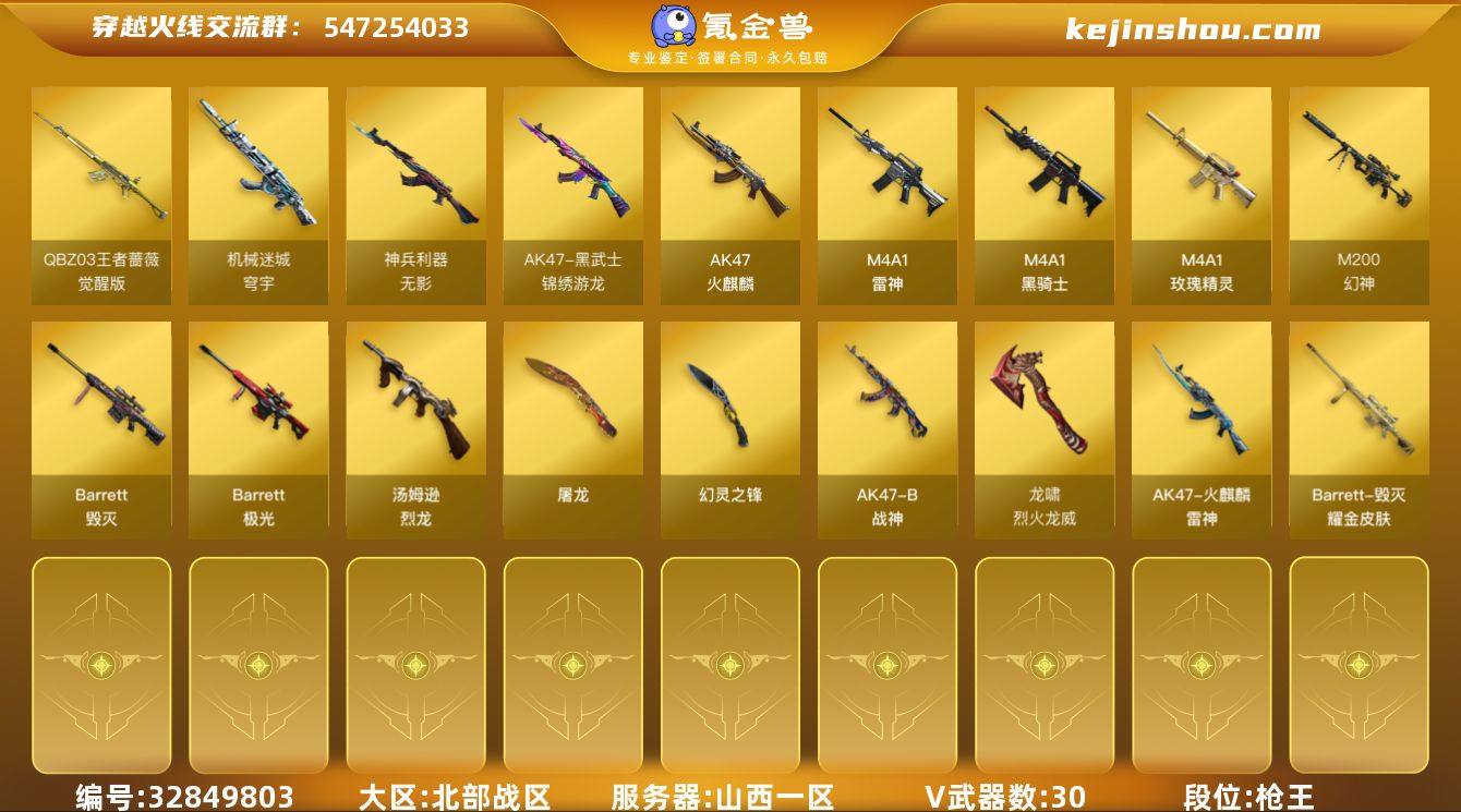 山西一区-35V-4王者武器数-0炫金武器数 【热门武器】:M200-幻神,死亡之眼,M4A1-黑骑士,汤姆逊-烈龙 【王者炫金武器】:王者之魄高爆手雷 【音效卡】:屠龙-电竞之星-竞星跃动音效卡,HK417-朱雀-电竞之星-竞星跃动音效卡 【皮肤】:雷神-荣耀之魄,火麒麟-雷神,毁灭耀金皮肤,毁灭-英雄计划 皮肤,毁灭-斗烈龙驹 皮肤 【角色】:王者春,王者影豹,乔伊教练,云海玲珑,幻面灵狐,飞虎队-X,虎妞,嘉年华灵狐,兰-新年限定,灵狐者-X,麻雀,潘多拉-X,潘多拉-甜心教官,蜀雪,兔囡囡,夜玫瑰-幻能朋克,樱-战斗天使,樱-缤纷夏日,团团 【人偶武器】:AWM-灵狐-15周年嘉年华,迷你波特博士,夺魂,迷你牛牛,深渊终结者手雷 【暴走生化】:死亡之眼,超级对讲机 【挑战大师】:AK47-冰龙粉碎者,冰龙粉碎者-白马银枪,激光毁灭者III-白马银枪,神圣爆裂者-末日III 【英雄级武器】:AK47-火麒麟,M4A1-雷神,M4A1-黑骑士,无影-神兵利器,黑武士-锦绣游龙,M4A1-玫瑰精灵,AK47-B-战神,QBZ-03-王者蔷薇-觉醒版,HK417-朱雀-电竞之星,机械迷城-穹宇,天罚-斗烈龙驹,Barrett-毁灭,Barrett-极光,M200-幻神,汤姆逊-烈龙,屠龙,幻灵之锋,屠龙-电竞之星,屠龙-斗烈龙驹...