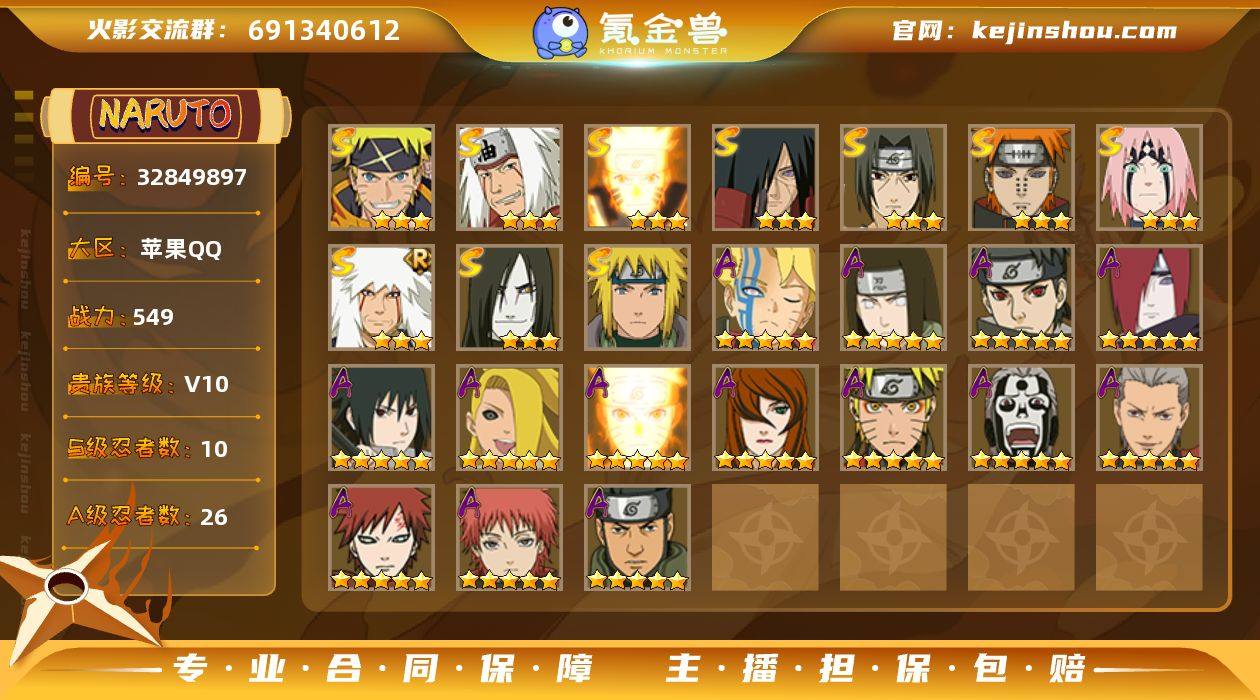 实名: 可修改 贵族等级: V10 S忍数: 10 A忍数: 26 战力值(万): 549 S级忍者: 宇智波斑「秽土转生」,佩恩「天道」,大蛇丸,波风水门,宇智波鼬 「须佐能乎」,自来也 「舞之豪杰」,漩涡鸣人 「九喇嘛连结」,春野樱 「忍界大战」,自来也 「传说中的三忍」,漩涡鸣人·宇智波佐助 热门A级忍者: 宇智波佐助「须佐能乎」