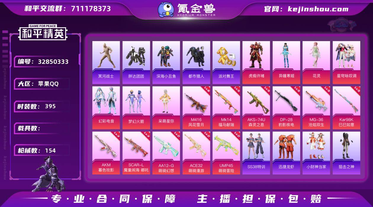 【主播推荐】实名: 可修改 时装数: 395 枪械数: 154 战备数: 128 热门装扮: 梦幻火箭(新101),深海小丑鱼,鹰眼刺客,都市猎人,冥河战士,胖达团团,派对舞王,呆萌星弥,星穹咏叹调,幻彩电音,花灵,异瞳寒姬,虎痴许褚 稀有枪皮: M416风花雪月,Kar98K-巳巳如意,DP-28-豹影疾电,SCAR-L-魔童闹海 哪吒,MG-36-沧焰双生,AKM-暮色玫影,AKS-74U-森灵之息,AA12-G-萌骑幻想,ACE32-萌骑漫游,UMP45-萌骑冒险