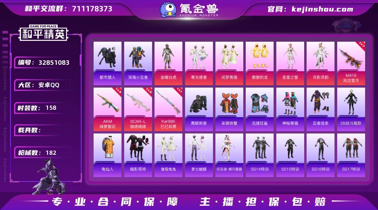安卓 【小号 套装-都市猎人/套装-深海小丑鱼/套装-龟仙人/套装-暗影哥特/AKM-绿萝繁花(五级)/SCAR-L-锦绣绵绵(五级)/M416-风花雪月(七级)/百万伏特背包(1级)/幻影战神背包】手Q-6粉装-4特效枪-0载具-4粉色飞行器-58162热力值-8王牌印记-158套装-182枪皮 【热门品类】:套装-都市猎人,套装-深海小丑鱼,套装-忍者信条,角色-2B战斗服款,套装-龟仙人,套装-暗影哥特 【粉色套装】:粉装-金曜白虎,粉装-寒光使者,粉装-闲梦青缨,粉装-傲傲奶龙,角色-圣堂之誓,角色-月影灵韵 【粉色枪皮等级】:AKM-绿萝繁花(五级),SCAR-L-锦绣绵绵(五级),M416-风花雪月(七级),Kar98K-巳巳如意(一级) 【粉色枪皮】:AKM-绿萝繁花,SCAR-L-锦绣绵绵,M416-风花雪月,Kar98K-巳巳如意 【粉色飞行器】:超新星飞行器,沙丘之主天马,祥瑞锦鲤飞行器,花傲天飞行器 【粉色降落伞】:幻影战神降落伞,齐天大圣降落伞,碧影闪光降落伞,未来歌姬降落伞,炫光之旅降落伞,莲影清波降落伞,圣堂之誓降落伞,沙丘之主降落伞,猪猪侠降落伞,精灵梦叶罗丽降落伞,创世·救赎降落伞 【稀有套装】:套装-龟仙人,套装-雏菊兔兔,套装-萝兰蝴蝶,角色-狂花道·娜可露露 【稀有枪皮】:AKM-夜灯,AKM-彩虹...