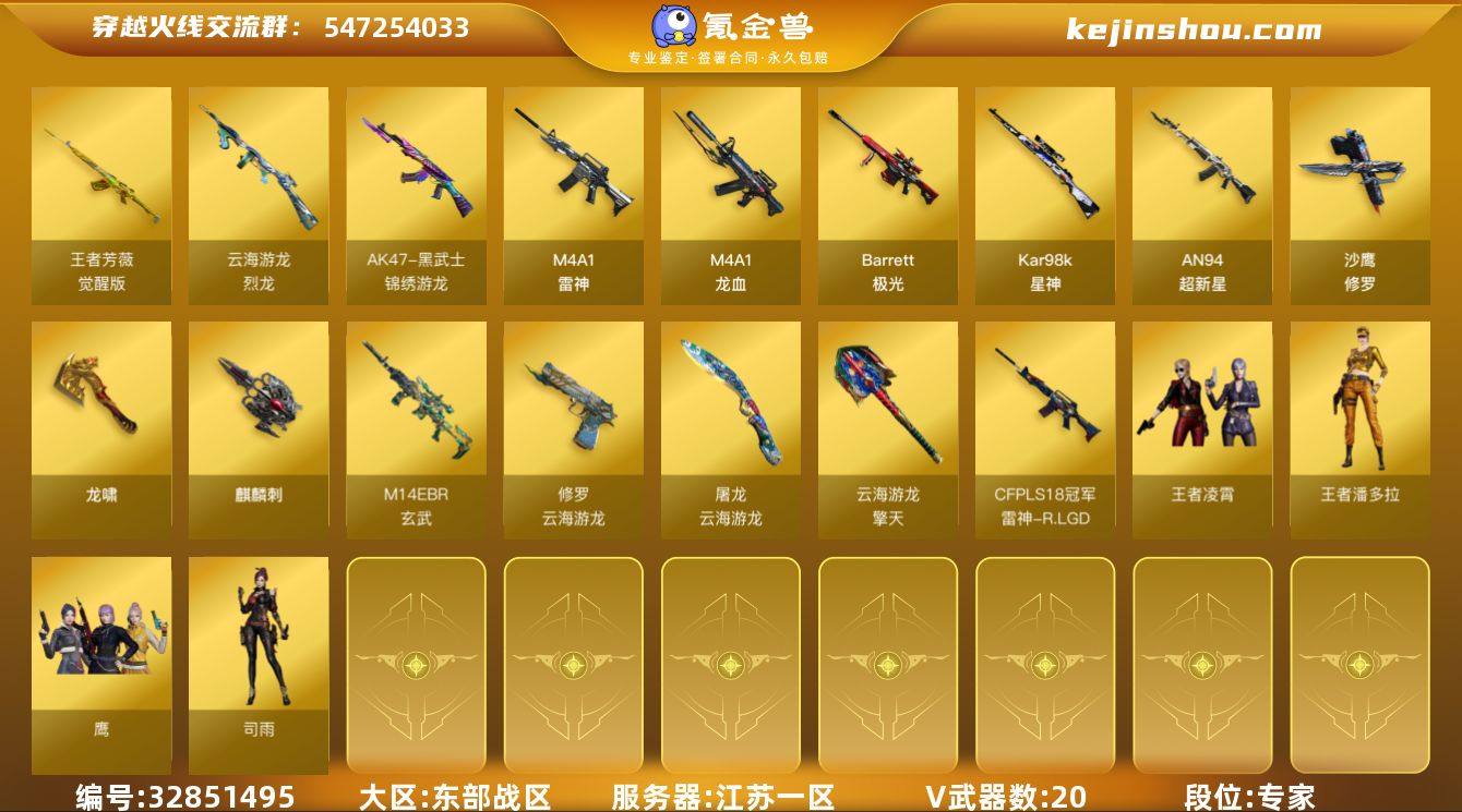 江苏一区-24V-2王者武器数-0炫金武器数 【热门武器】:M14EBR-玄武,Kar98K-星神,沙鹰-修罗*6 【皮肤】:雷神-R.LGD-CFPLS18冠军,极光-能量核心 【角色】:鹰,司雨,王者凌霄,王者潘多拉,云海玲珑,空,风暴女,铁骑荣耀,兔囡囡,新娜塔莎,幽 【人偶武器】:迷你深渊冰龙,迷你波特博士,迷你曼提柯尔,迷你火种 【挑战大师】:激光毁灭者III-白马银枪,机甲撕裂者III,试炼破坏者III 【英雄级武器】:M4A1-雷神,AN94-超新星,M4A1-龙血,M14EBR-玄武,黑武士-锦绣游龙,王者芳薇-觉醒版,Barrett-极光,Kar98K-星神,炼狱-悦蓝-觉醒版,烈龙-云海游龙,沙鹰-修罗*6,修罗-云海游龙,龙啸,麒麟刺,擎天-云海游龙,屠龙-云海游龙,手雷-云海游龙 【其他武器】:源·火麒麟,魂·M4A1-雷神-化蛇,魂·雷神-新春神龙,魂·黑骑士-幻能朋克,魂·黑骑士-破浪10年,御·黑骑士-冰魄,御·黑骑士·哪吒闹海,御·超新星-圣诞,源·武圣,源·机械迷城,魂·龙血-锋芒破茧,魂·HK417-朱雀-凤灵,灵·HK417-朱雀-甜蜜火力,源·HK417-朱雀,魂·9A91·烈火-电子连击,源·天龙*2,魂·裁决-凤灵,魂·毁灭-航天科技*2,魂·毁灭-青帝,魂·Barrett-朱雀- 新春神龙,源·Barrett-朱雀,魂·炼狱-玩具...