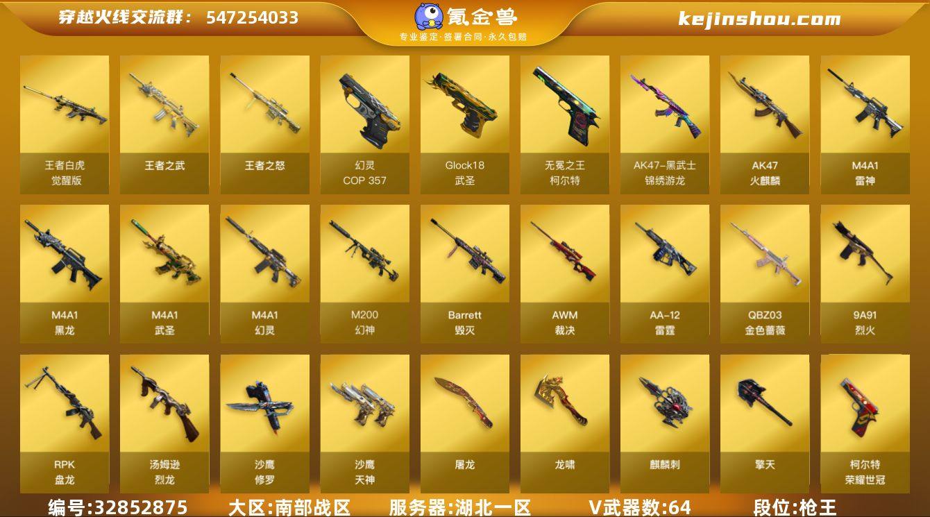 【ky6558】湖北一区-71V-5王者武器数-0炫金武器数 【热门武器】:QBZ03-金色蔷薇,M200-幻神,死亡之眼,荣耀世冠-柯尔特,汤姆逊-烈龙*6,RPK-盘龙,COP 357-幻灵*2,沙鹰-修罗*2 【王者炫金武器】:王者之武,王者之怒 【音效卡】:天神-动感闪耀 音效卡,M4A1-雷神音效卡,Barrett-毁灭音效卡 【皮肤】:幻神-CFS2022,白虎-白鲨-CFPLS23冠军,QBZ03-CFS2024 皮肤,裁决-胜者为王 皮肤,雷神-冠军之魄,雷神-动感闪耀 皮肤,火麒麟-华夏之心,火麒麟-巅峰荣耀,毁灭-CFS2020,黑龙-能量核心,黑龙-暗月,黑龙-墨子皮肤,黑骑士-暗月,无影-暗月,无影-霓裳皮肤,天启-暗月,天龙-秘银*2,修罗-能量核心,天神-暗月,龙啸-冠军之啸 【角色】:影豹,月兔特工,王者-瞳-闭月羞花,王者零-华冠丽服,王者沙漠玫瑰,乔伊教练,幻面灵狐,飞虎队-X,灵狐者-X,灵狐者-黄金海岸,潜龙队-X,铁骑荣耀,兔囡囡,新娜塔莎,游珑儿,雅典娜 【人偶武器】:迷你生化手雷 【暴走生化】:死亡之眼,超级对讲机 【挑战大师】:试炼破坏者III 【英雄级武器】:AK47-火麒麟,M4A1-黑龙,M4A1-雷神*2,M4A1-武圣,M4A1-幻灵,黑武士-锦绣游龙,QBZ03-金色蔷薇,9A91-烈火,烈火-动感闪耀,王...