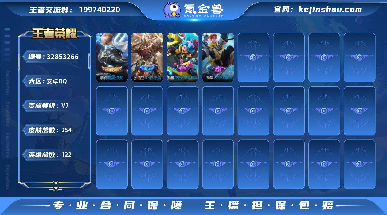 2185375-【鸣剑曳影】:安卓Q-V7-永恒钻石IV段位-122英雄-254皮肤-1典藏-0无双-1珍品传说-6传说-65史诗