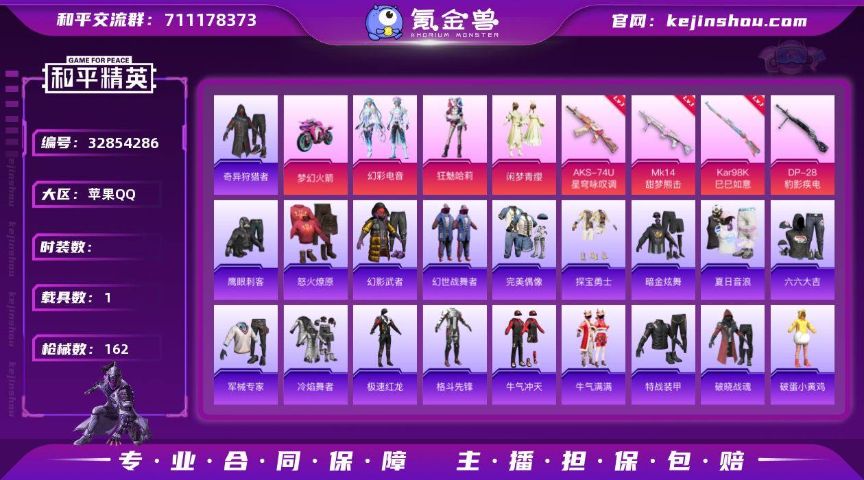 【满地铁天赋】c28756-【可二次】【因赛季更新游戏段付以上号为准!】 苹果Q-1稀有1载具3粉装5特效枪8热门115套装162枪皮 2印记 历史超级王牌1星 【1稀有】 奇异狩猎者 【1载具】 双人摩托梦幻火箭 【3粉装】 狂魅哈莉 闲梦青缨 幻彩电音 【5特效枪】 AKS-74U-星穹咏叹调 (6级) Kar98K-巳巳如意 (5级) DP-28-豹影疾电 (4级) Mk14-甜梦熊击 (5级) Mk14-福马献瑞 (1级) 【8热门】 龟仙人 鹰眼刺客 粉红小猪 漫步者 破蛋小黄鸡 极速红龙 军刀雅典娜 AKM-奇异狩猎者