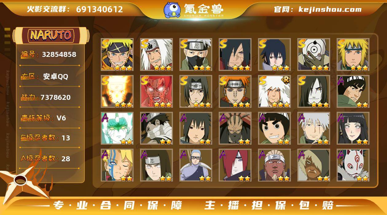 13S忍/28A忍/战力737W/V6/区服2883 【S忍者】 宇智波佐助「漩涡鸣人」,宇智波斑「秽土转生·解」,宇智波佐助「永恒万花筒」,漩涡鸣人「九喇嘛连结」,迈特凯「死门」,自来也「舞之豪杰」,旗木卡卡西「须佐能乎」,自来也「传说中的三忍」,宇智波斑「白面具」,宇智波鼬「须佐能乎」,佩恩「天道」,波风水门,大蛇丸, 【A忍者】 巳月「仙人模式」,迈特凯「青春爆炸」,长十郎「六代目水影」,日向宁次「忍界大战」,漩涡博人「桃式显现」,日向雏田「最终章」,旗木卡卡西「幻之真容」,李洛克「忍界大战」,蝎「绯流琥」,宇智波泉奈,桃地再不斩「秽土转生」,长门「青年」,艾「青年」,达鲁伊「五代目雷影」,神秘面具男「忍者之路」,波风水门「青年」,宇智波佐助「须佐能乎」,千代「近松十人卫」,秋道丁次「忍界大战」,飞段「死司凭血」,飞段,迪达拉,我爱罗「疾风传」,蝎,干柿鬼鲛,宇智波鼬,猿飞阿斯玛,迈特凯, PX_2438147