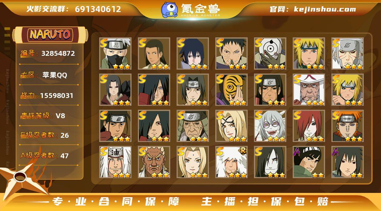 IOS/26S忍/47A忍/战力1559W/V8/区服38 【S忍者】 千手柱间「木叶创立」,宇智波佐助「永恒万花筒」,宇智波带土「忍界大战」,千手柱间「秽土转生」,自来也「舞之豪杰」,旗木卡卡西「须佐能乎」,宇智波鼬「秽土转生」,药师兜「仙人模式」,宇智波斑「秽土转生」,宇智波斑「白面具」,千手扉间「秽土转生」,纲手「百豪」,波风水门「秽土转生」,猿飞日斩「秽土转生」,长门「秽土转生」,宇智波斑,千手柱间,艾「四代目雷影」,神秘面具男,宇智波鼬「须佐能乎」,佩恩「天道」,猿飞日斩,波风水门,大蛇丸,自来也,纲手, 【A忍者】 迈特凯「青春爆炸」,日向宁次「忍界大战」,李洛克「忍界大战」,蝎「绯流琥」,宇智波泉奈,角都「秽土转生」,宇智波止水,达鲁伊「五代目雷影」,神秘面具男「忍者之路」,波风水门「青年」,奇拉比「忍界大战」,宇智波佐助「须佐能乎」,加藤断,迪达拉「秽土转生」,漩涡鸣人「九尾查克拉」,角都「晓创生」,千代「近松十人卫」,药师兜「半蛇斗篷」,地陆,宇智波佐助「疾风传咒印」,我爱罗「忍界大战」,秋道丁次「忍界大战」,大蛇丸「晓」,猿飞阿斯玛「秽土转生」,春野樱「百豪」,照美冥「五代目水影」,勘九郎「忍界大战」,猿飞日斩「火影继承人」,宇智波佐助「万花筒...