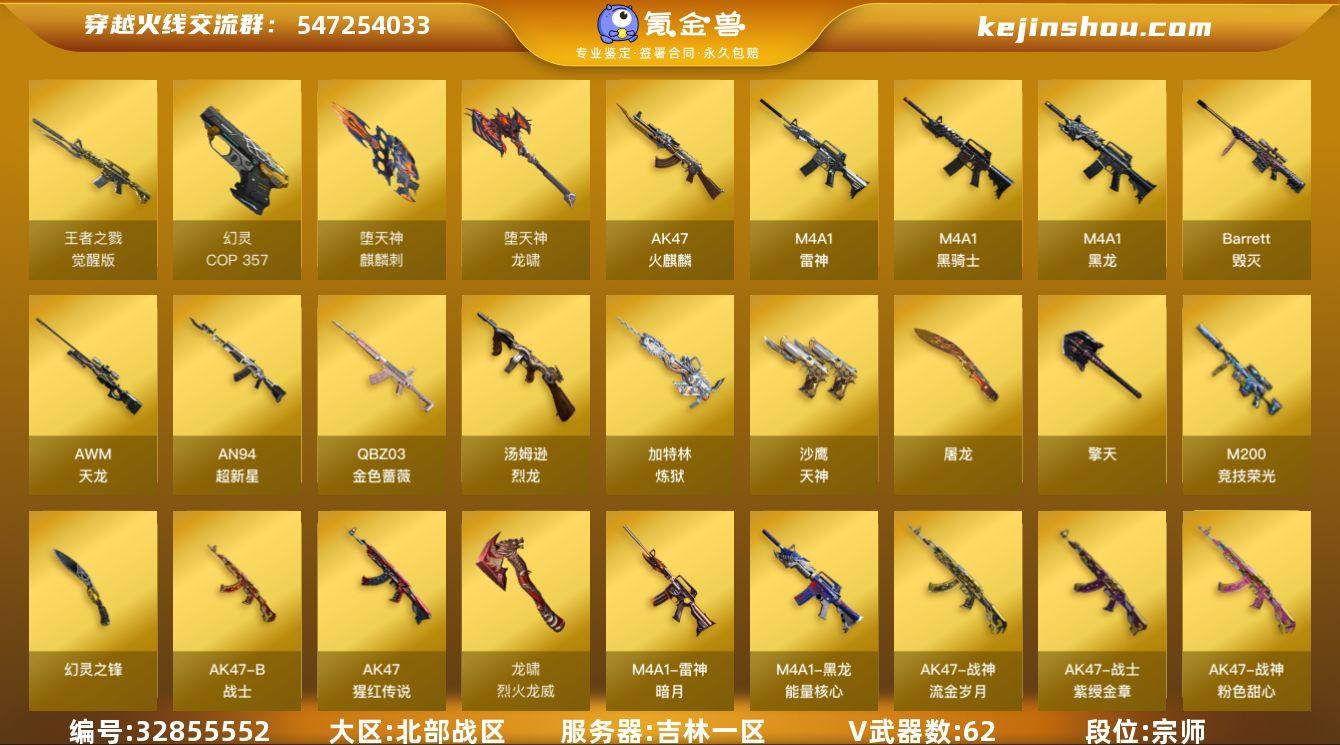 【945101】吉林一区-68V-1王者武器数-0炫金武器数 【热门武器】:QBZ03-金色蔷薇,M200-竞技荣光,M4A1-黑骑士,汤姆逊-烈龙,加特林-炼狱,雷神-小红,COP 357-幻灵,金刚伞 【音效卡】:M4A1-黑骑士音效卡 【皮肤】:雷神-暗月,火麒麟-心动糖果,毁灭耀金皮肤,黑龙-能量核心*2,战神-粉色甜心皮肤,战神-紫绶金章皮肤,战神-流金岁月皮肤 【角色】:葵,迷迭香,影豹,电竞教官-云悠悠,暗夜-X,初恋灵狐,芳心审判者,嘉年华灵狐,灵狐者-X,麻雀,曼陀罗-X,潘多拉-X,潘多拉-甜心教官,斯沃特-X,蜀雪,影武者-X,潘多拉-N 【人偶武器】:雷神-小红,巴雷特-零-水下丽影,AWM-灵狐-15周年嘉年华,M37-葵,夺魂 【暴走生化】:超级对讲机 【挑战大师】:激光毁灭者III,机甲撕裂者III 【英雄级武器】:AK47-火麒麟*2,M4A1-黑龙,M4A1-雷神,M4A1-黑骑士,AN94-超新星,QBZ03-金色蔷薇,王者之戮-觉醒版,AK-47-猩红传说*3,AK47-B-战士,AWM-天龙,Barrett-毁灭,M200-竞技荣光,Barrett-金色蔷薇,加特林-炼狱,汤姆逊-烈龙,沙鹰-天神,COP 357-幻灵,屠龙*4,麒麟刺-堕天神,擎天,幻灵之锋*2,龙啸-堕天神,龙啸-烈火龙威,高爆手雷-堕天神*4,高爆手雷-幻灵*5,高...