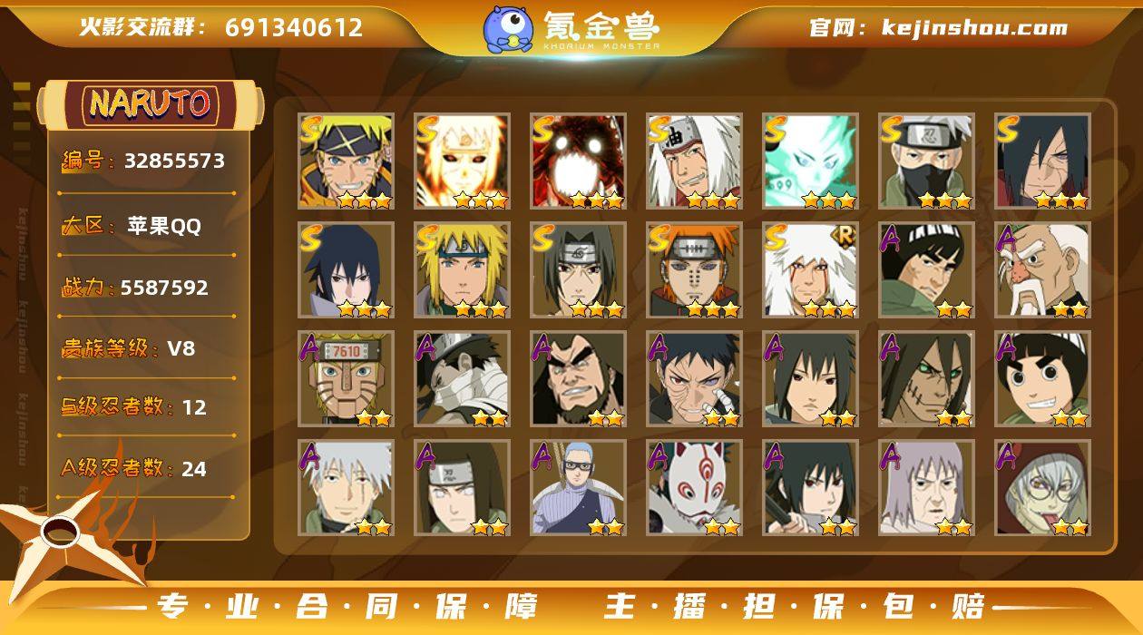IOS/12S忍/24A忍/战力558W/V8/区服3775 【S忍者】 宇智波佐助「漩涡鸣人」,宇智波斑「秽土转生·解」,宇智波佐助「永恒万花筒」,自来也「舞之豪杰」,旗木卡卡西「须佐能乎」,大筒木舍人「最终章」,自来也「传说中的三忍」,漩涡鸣人「暴怒·第六尾」,宇智波鼬「须佐能乎」,佩恩「天道」,波风水门,波风水门「九喇嘛连结」, 【A忍者】 机械鸣人「初始形态」,大野木「侠隐江湖」,迈特凯「青春爆炸」,长十郎「六代目水影」,日向宁次「忍界大战」,旗木卡卡西「幻之真容」,李洛克「忍界大战」,宇智波泉奈,宇智波带土「漂泊浪客」,神农「羁绊」,桃地再不斩「秽土转生」,角都「秽土转生」,神秘面具男「忍者之路」,宇智波佐助「须佐能乎」,千代「近松十人卫」,药师兜「半蛇斗篷」,飞段「死司凭血」,飞段,我爱罗「疾风传」,蝎,干柿鬼鲛,猿飞阿斯玛,迈特凯, PX_2422416